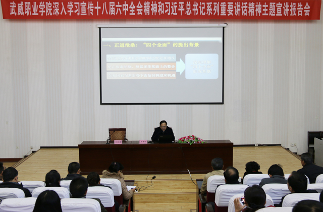 根據(jù)省委和全省宣傳工作會(huì)議關(guān)于在全省組織開(kāi)展深入學(xué)習(xí)宣傳十八屆五中全會(huì)精神和習(xí)近平總書(shū)記系列重要講話精神主題宣講活動(dòng)的通知要求,為向全院黨員干部和師生宣傳好、解讀好十八屆五中、六中全會(huì)精神和習(xí)近平總書(shū)記系列重要講話的實(shí)質(zhì)內(nèi)涵和深遠(yuǎn)意義,將全會(huì)精神和總書(shū)記系列重要講話精神作為指導(dǎo)和推動(dòng)學(xué)院各項(xiàng)事業(yè)快速發(fā)展的科學(xué)理論和強(qiáng)大動(dòng)力。10月29日上午,“武威職業(yè)學(xué)院深入學(xué)習(xí)宣傳十八屆五中、六中全會(huì)精神和習(xí)近平總書(shū)記系列重要講話精神主題宣講報(bào)告會(huì)”在學(xué)院尚德樓正德廳舉行。會(huì)議邀請(qǐng)省委講師團(tuán)成員、蘭州大學(xué)馬克思主義學(xué)院博士生導(dǎo)師王學(xué)儉教授蒞臨學(xué)院,作題為“四個(gè)全面”戰(zhàn)略布局解讀的宣講報(bào)告。學(xué)院黨委副書(shū)記趙明,副院長(zhǎng)王永緒、潘玉華、田迎春,全體中層干部,各部門師生代表共計(jì)260余人參加宣講報(bào)告會(huì)。報(bào)告會(huì)由田迎春主持。