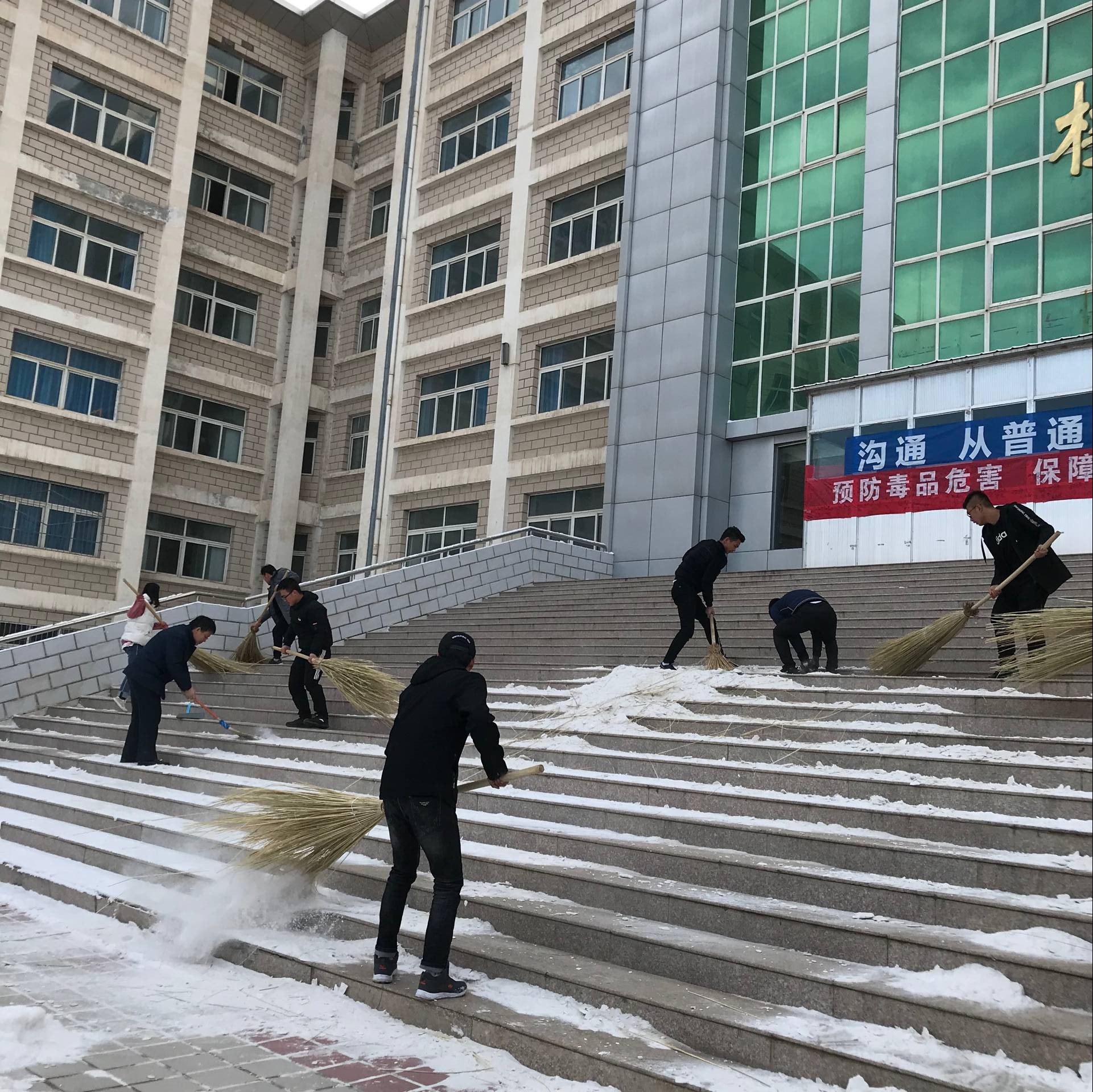 此次活動在博學樓前開展,10多名黨員及入黨積極分子參加此次活動。大家?guī)е鴴咧恪Ⅳせ惹鍜吖ぞ?,在利用課間操的時間將行人走道及樓梯的落雪全部清掃干凈,為校園師生提供了良好的行走安全、衛(wèi)生環(huán)境。