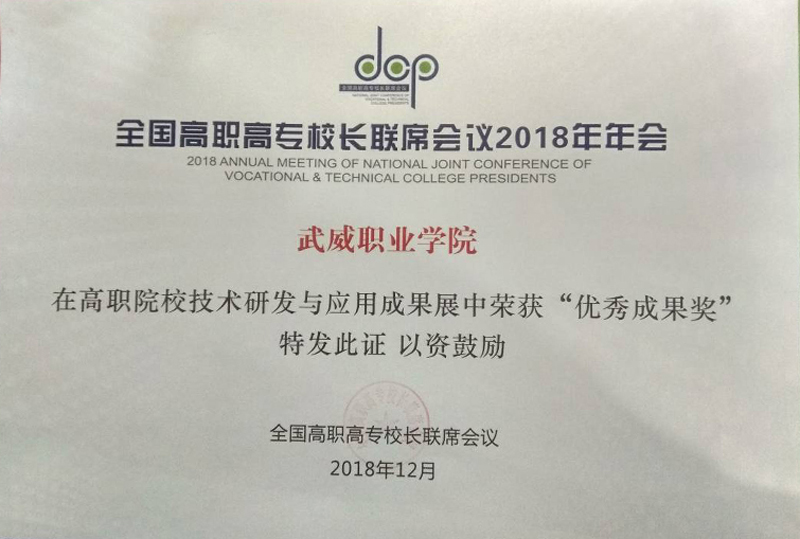 12月8日至9日,學(xué)院黨委書記、院長(zhǎng)趙明教授、副院長(zhǎng)翟存祥教授帶隊(duì)參加了在福建福州召開的全國(guó)高職高專校長(zhǎng)聯(lián)席會(huì)議2018年年會(huì)。學(xué)院自主研發(fā)的“光伏組件智能清潔裝置”榮獲高職院校技術(shù)研發(fā)與應(yīng)用成果 “優(yōu)秀成果獎(jiǎng)”(全國(guó)僅36所高職院校獲此殊榮,甘肅省僅2所),“學(xué)院與中科院先進(jìn)核能創(chuàng)新研究院聯(lián)合辦學(xué)創(chuàng)新發(fā)展”案例入選教育成果案例展。