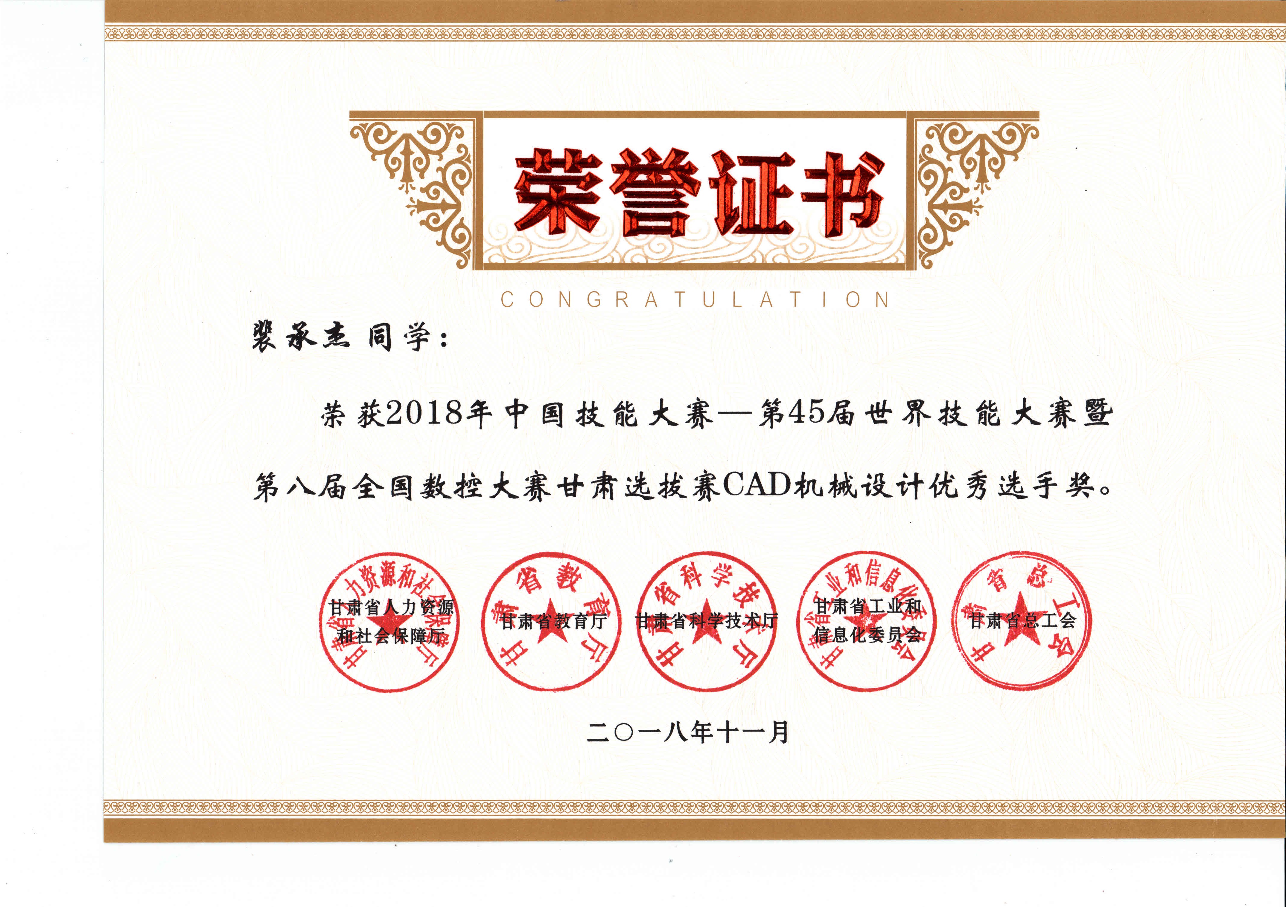 2018年中國(guó)技能大賽--第45屆世界技能大賽暨第八屆全國(guó)數(shù)控大賽甘肅選拔賽(CAD機(jī)械設(shè)計(jì)項(xiàng)目)獲獎(jiǎng)證書