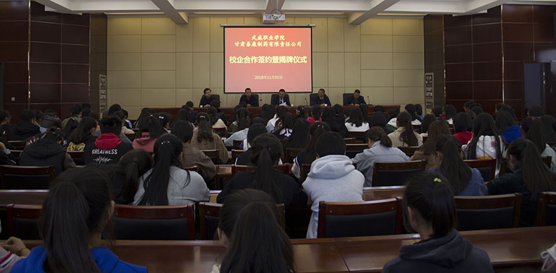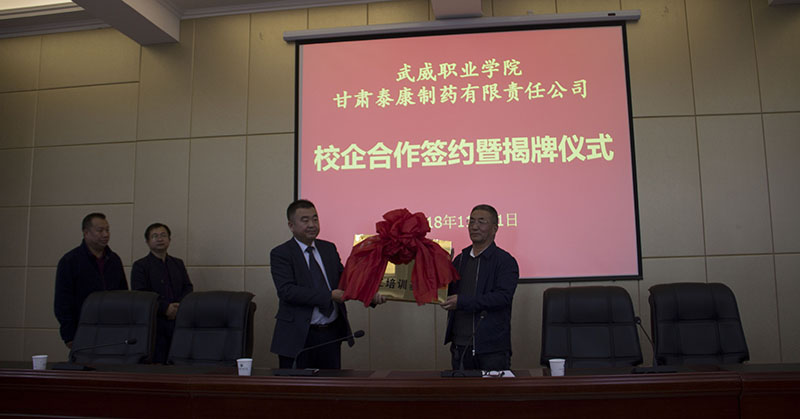 為提高人才培養(yǎng)質(zhì)量和辦學水平,加強校企協(xié)同育人機制建設,11月1日下午,藥學系與甘肅泰康制藥有限責任公司校企合作共建“就業(yè)實習基地”簽約揭牌儀式在行樹樓北側會議室隆重舉行。甘肅泰康制藥有限責任公司投資方—北京久朝集團產(chǎn)業(yè)中心總監(jiān)楊宏超、公司總工程師毛著鴻、財務總監(jiān)郝敏等企業(yè)領導出席本次儀式。學院教務處處長仲生仁、招生就業(yè)處處長蔡柱山、藥學系主任魏潤明、副主任楊建美、黨總支副書記單光年及藥學系160余名師生參加了此次簽約揭牌儀式。儀式由魏潤明主持。