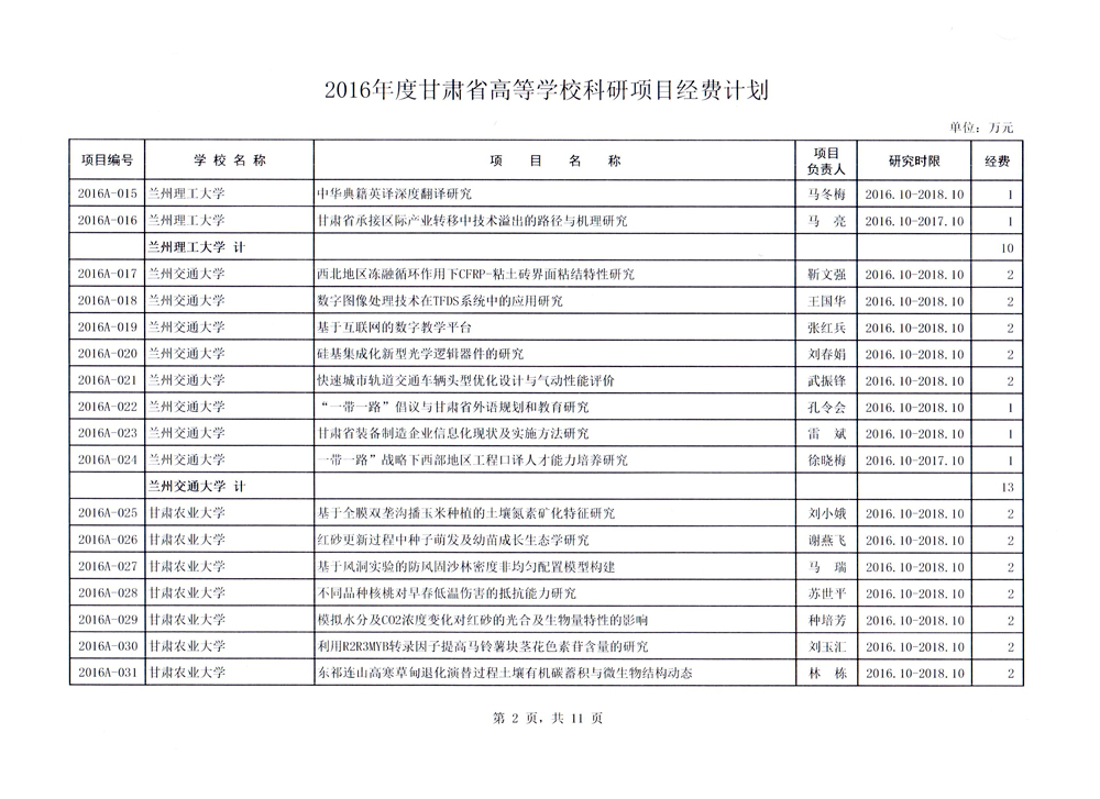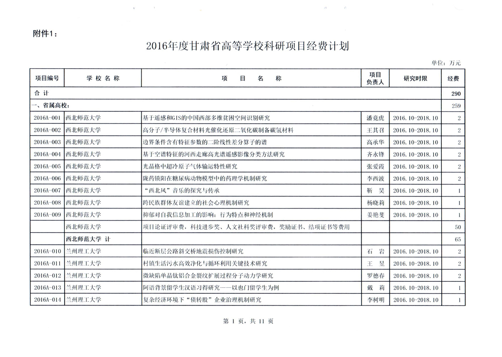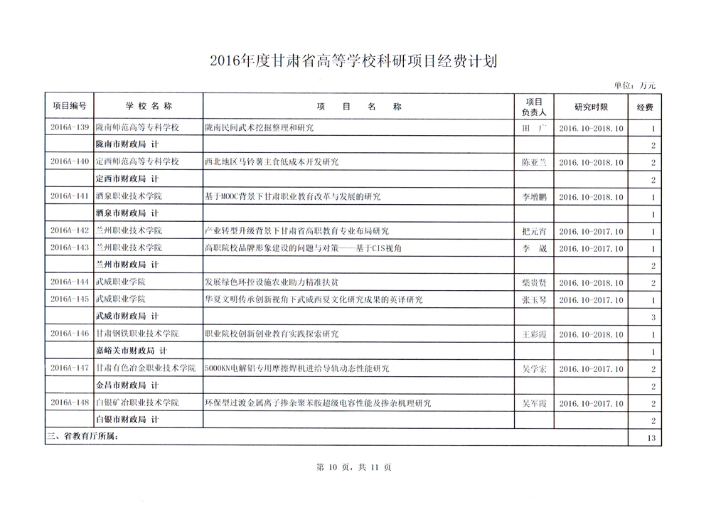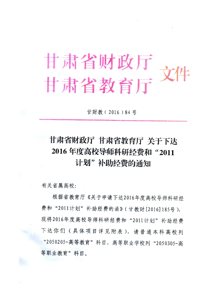 轉(zhuǎn)發(fā)甘肅省財政廳 教育廳文件 關(guān)于下達(dá)2016年度高校導(dǎo)師科研經(jīng)費和“2011計劃”補(bǔ)助經(jīng)費的通知
