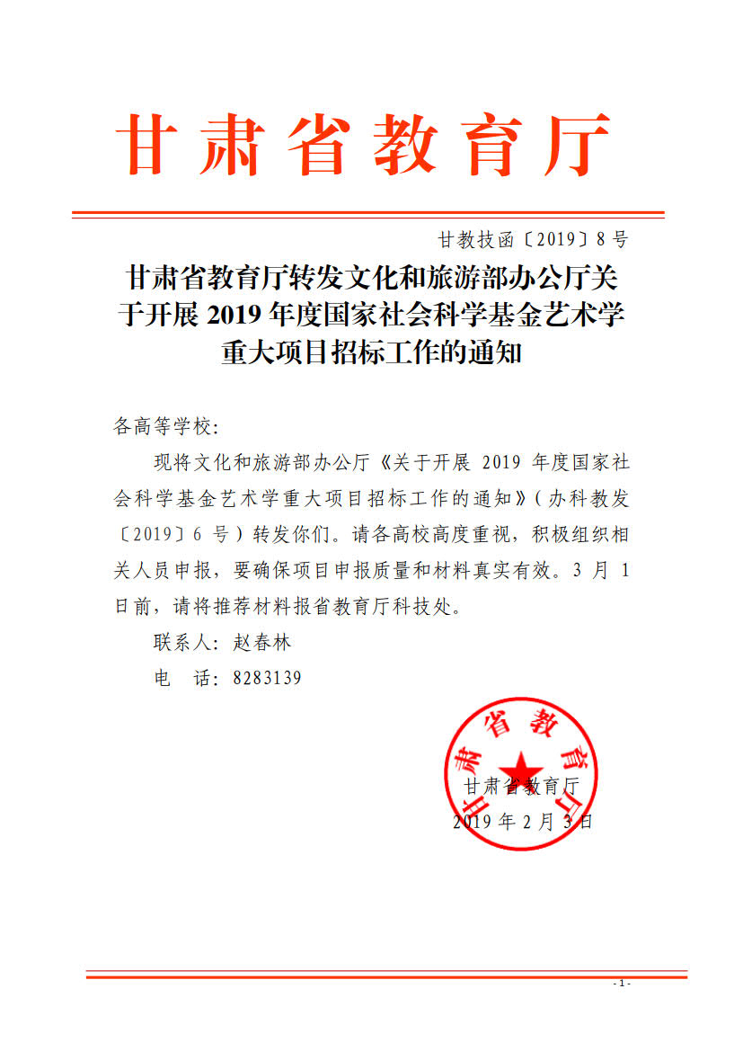 甘肅省教育廳轉(zhuǎn)發(fā)文化和旅游部辦公廳關(guān)于開展2019年度國(guó)家社會(huì)科學(xué)基金藝術(shù)學(xué)重大項(xiàng)目招標(biāo)工作的通知