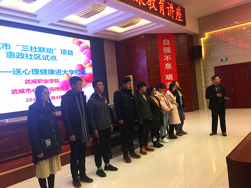 12月4日晚上,學(xué)生工作處聯(lián)合武威市“三社聯(lián)動(dòng)”惠政社區(qū)試點(diǎn)項(xiàng)目在學(xué)院菁英廳舉辦了心理健康專(zhuān)題講座暨心理信息員培訓(xùn)。此次講座邀請(qǐng)武威市心理咨詢師協(xié)會(huì)會(huì)長(zhǎng)何飛老師主講,學(xué)院各系輔導(dǎo)員、2017級(jí)、2018級(jí)班級(jí)心理信息員、心翼心理社團(tuán)會(huì)員等220多人聆聽(tīng)了講座。學(xué)生工作處處長(zhǎng)王守云主持活動(dòng)。