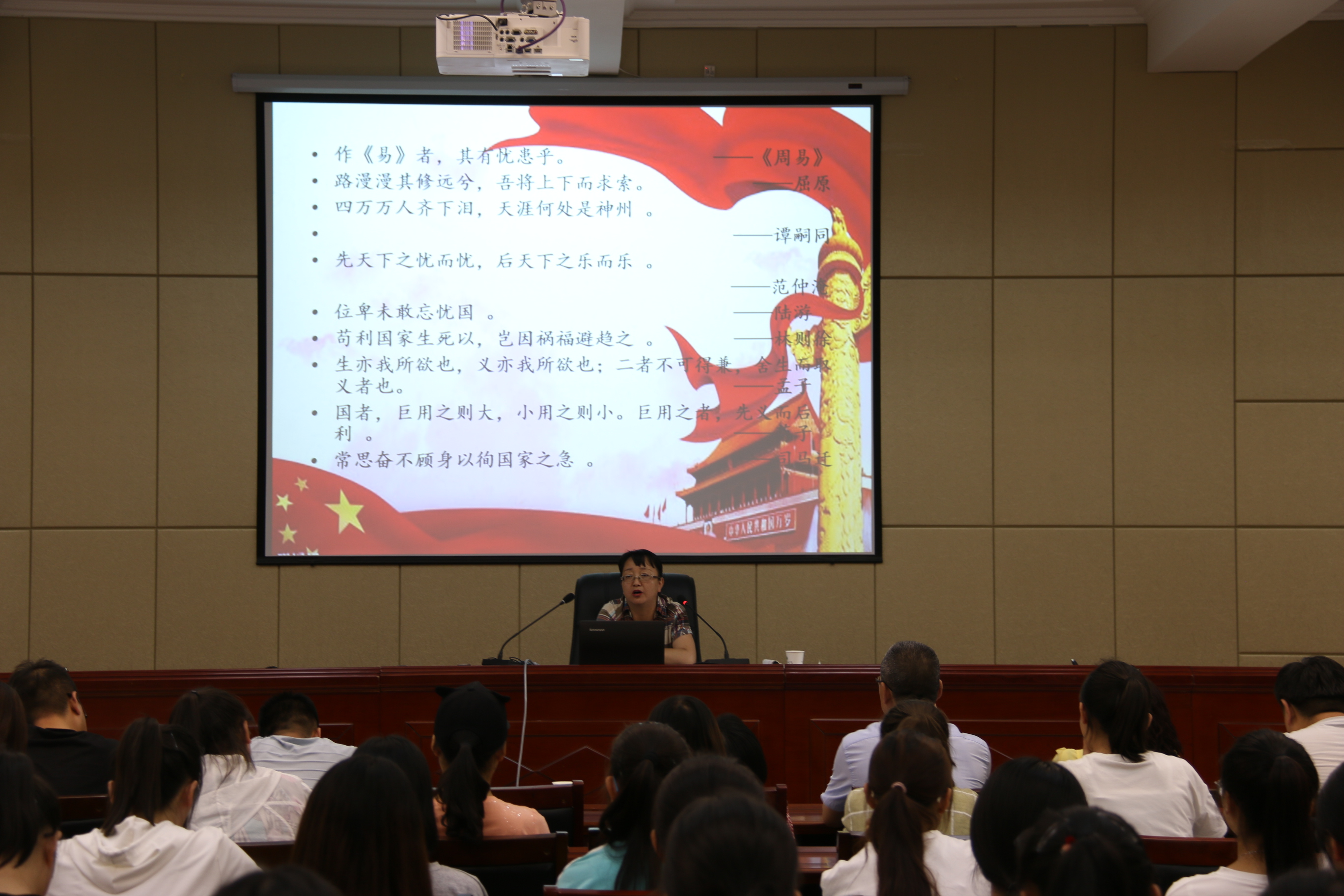 田迎春分別從溯源、求理、踐行三個(gè)方面深刻講解了愛國主義精神的傳承與弘揚(yáng)。一是探尋中華民族愛國主義精神的基因,歷史深刻表明,愛國主義自古以來就流淌在中華民族血脈之中,去不掉,打不破,滅不了;二是洞悉當(dāng)代中國愛國主義的思想真諦,指出對(duì)新時(shí)代中國青年來說,熱愛祖國是立身之本、成才之基。三是讓愛國主義精神代代相傳、發(fā)揚(yáng)光大,要求新時(shí)代師生要聽黨話、跟黨走,胸懷憂國憂民之心、愛國愛民之情,懂得奉獻(xiàn)祖國、奉獻(xiàn)人民,以一生的真情投入、一輩子的頑強(qiáng)奮斗來體現(xiàn)愛國主義情懷,讓愛國主義的偉大旗幟始終在心中高高飄揚(yáng)!