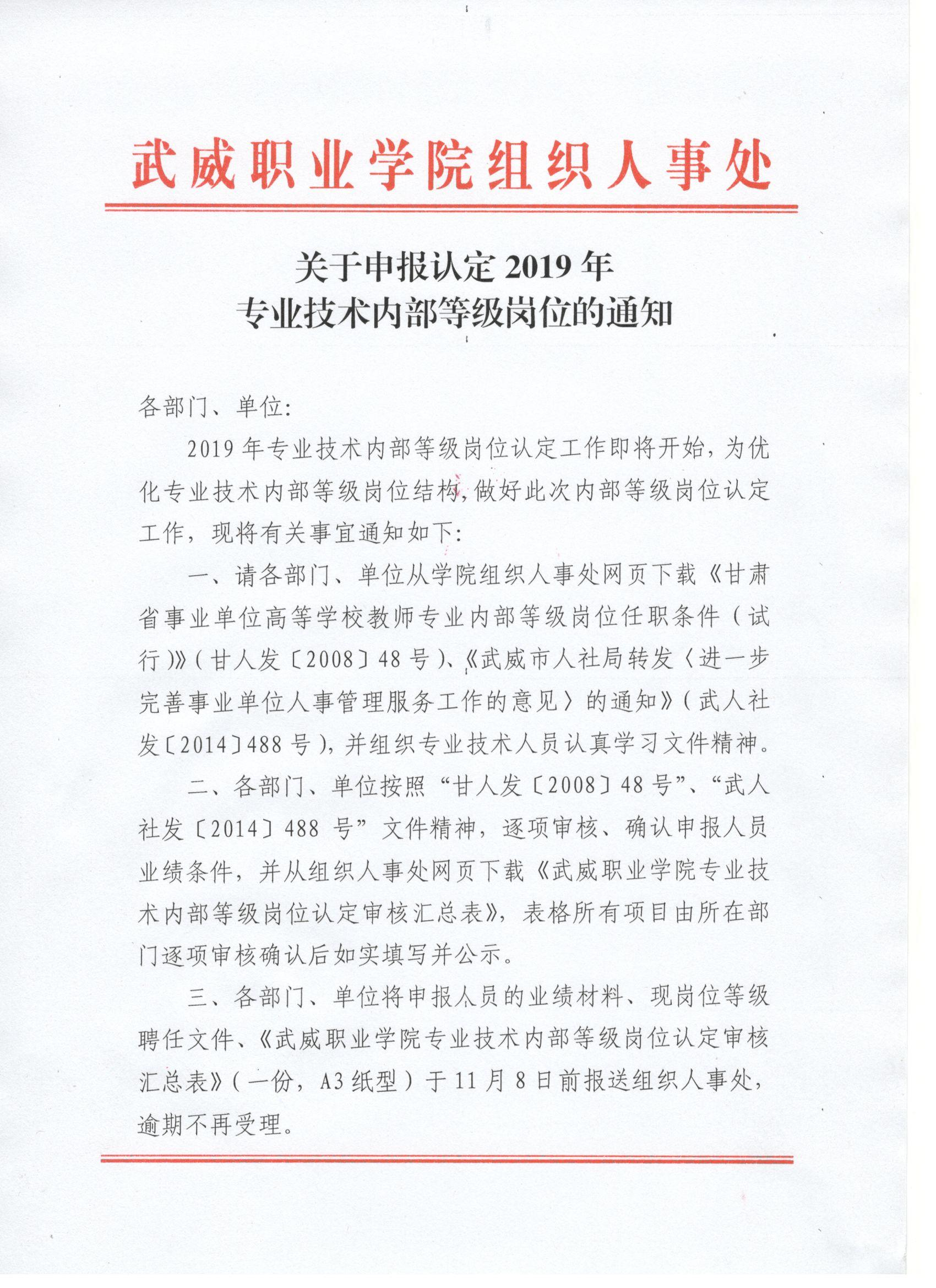 關于申報認定2019年專業(yè)技術內部等級崗位的通知