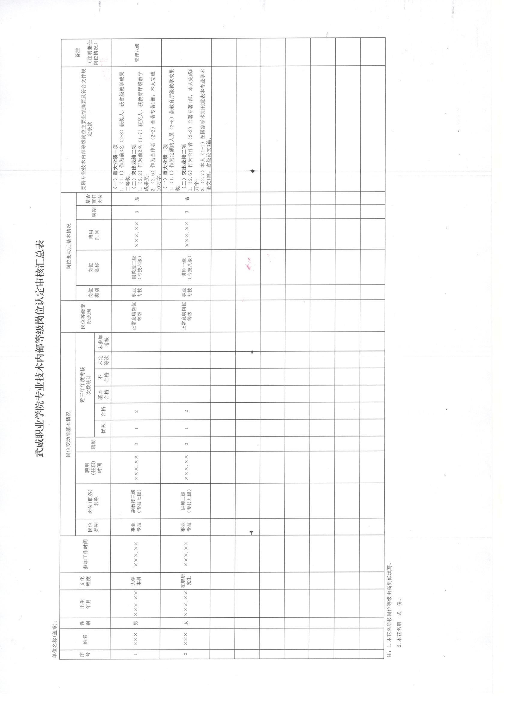 武威職業(yè)學院專業(yè)技術內部等級崗位認定審核匯總表2019 - 樣表