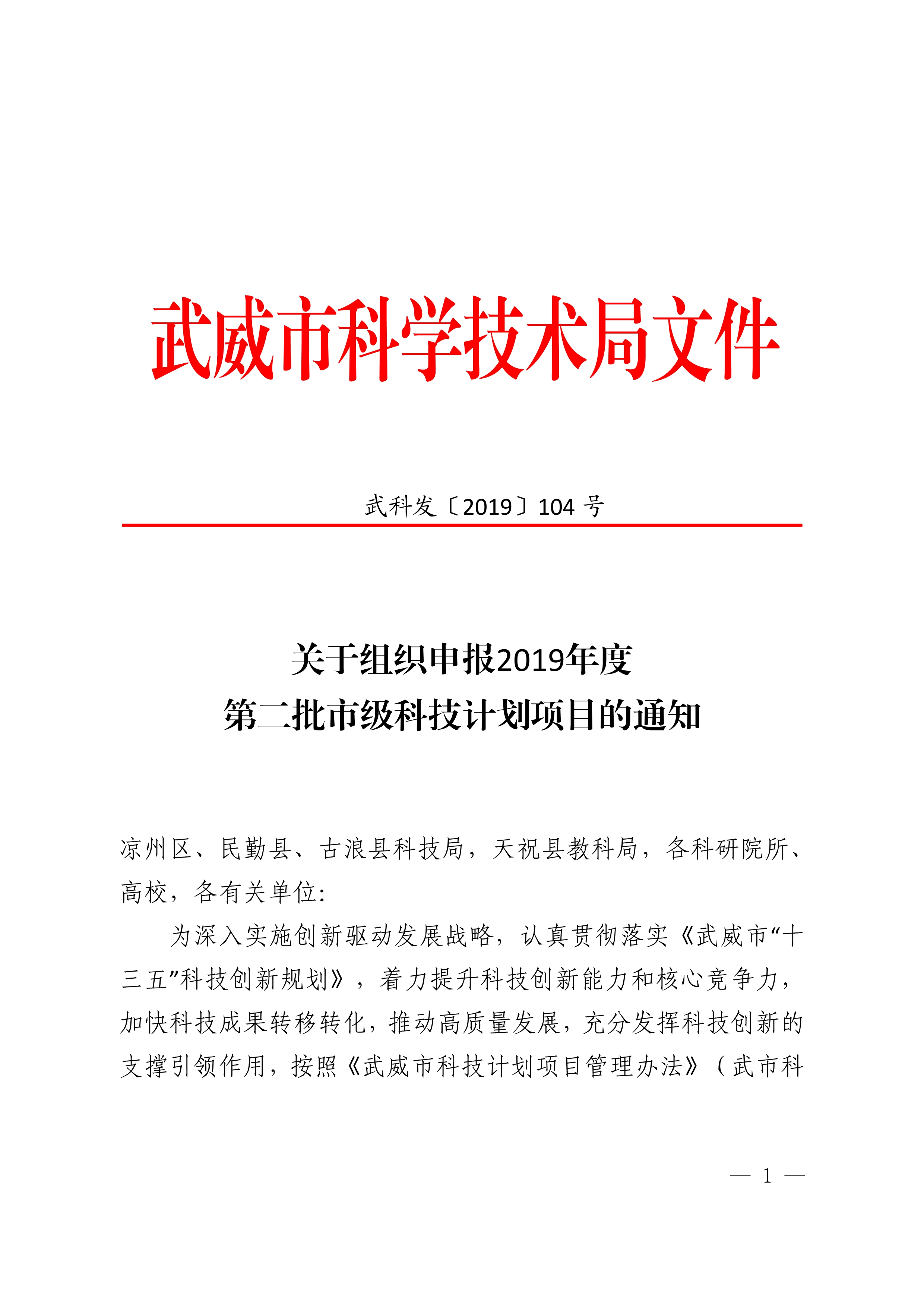 轉(zhuǎn)發(fā)武威市科學(xué)技術(shù)局關(guān)于組織申報2019年度第二批市級科技計(jì)劃項(xiàng)目的通知