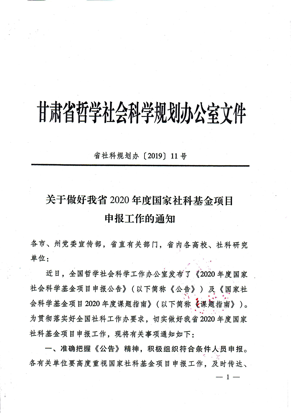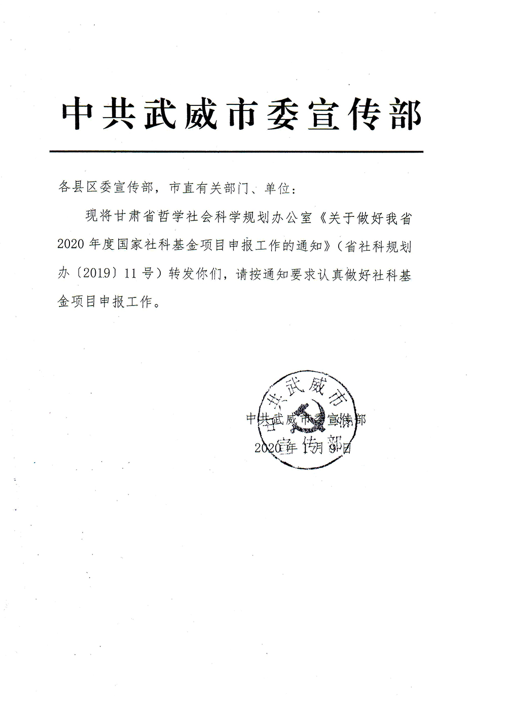 轉(zhuǎn)發(fā)中共武威市委宣傳部《關(guān)于做好甘肅省2020年度國(guó)家社科基金項(xiàng)目申報(bào)工作的通知》