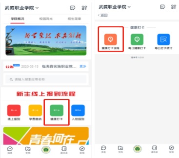 新生使用“智慧校園”賬號(hào),登錄釘釘平臺(tái),進(jìn)入“武威職業(yè)學(xué)院”組織架構(gòu),點(diǎn)擊武職門戶進(jìn)入新生線上報(bào)到流程。