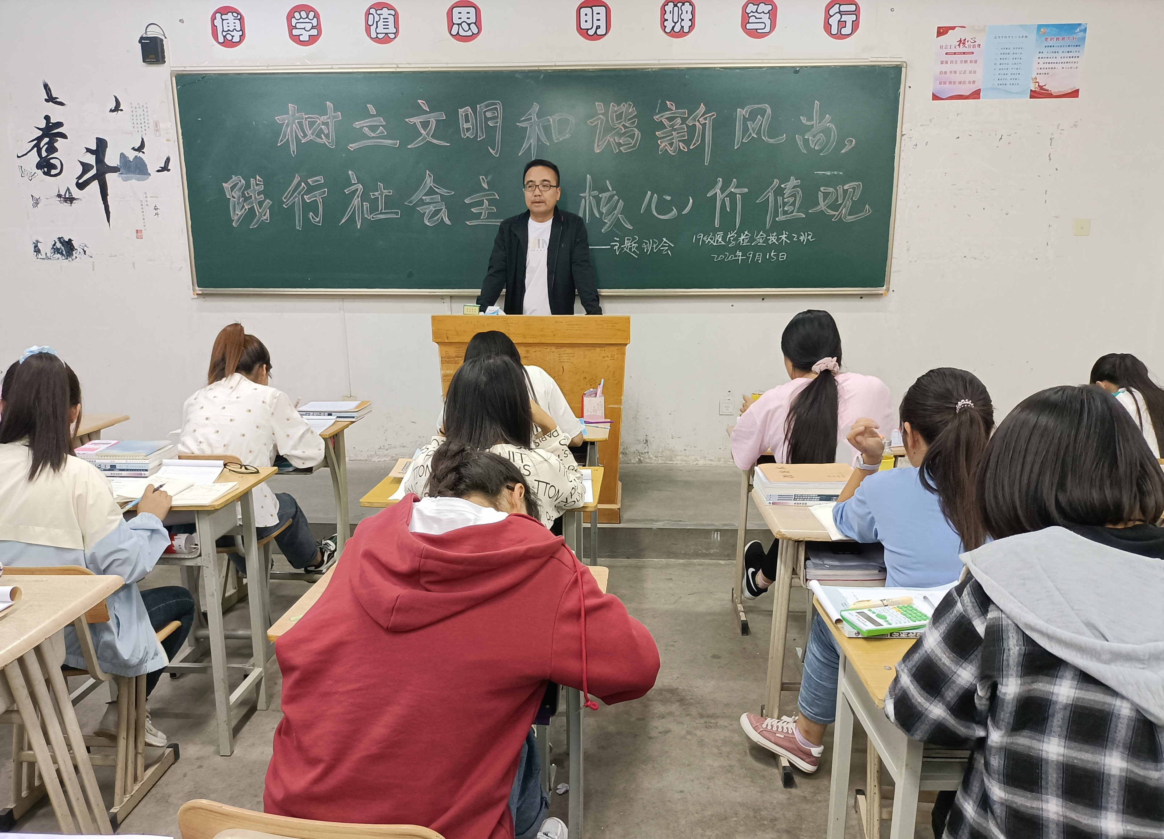 ?為深入學(xué)習(xí)習(xí)近平新時代中國特色社會主義思想和黨的十九大、十九屆四中全會精神,堅決落實學(xué)院關(guān)于文明校園和文明城市創(chuàng)建的各項安排部署,深入推進制止餐飲浪費行為系列活動,團結(jié)引領(lǐng)我系師生積極踐行社會主義核心價值觀,樹立文明和諧新風尚。醫(yī)學(xué)技術(shù)與信息管理系各教學(xué)班于2020年9月15日開展了“樹立文明新風尚,踐行社會主義核心價值觀”主題班會教育活動。