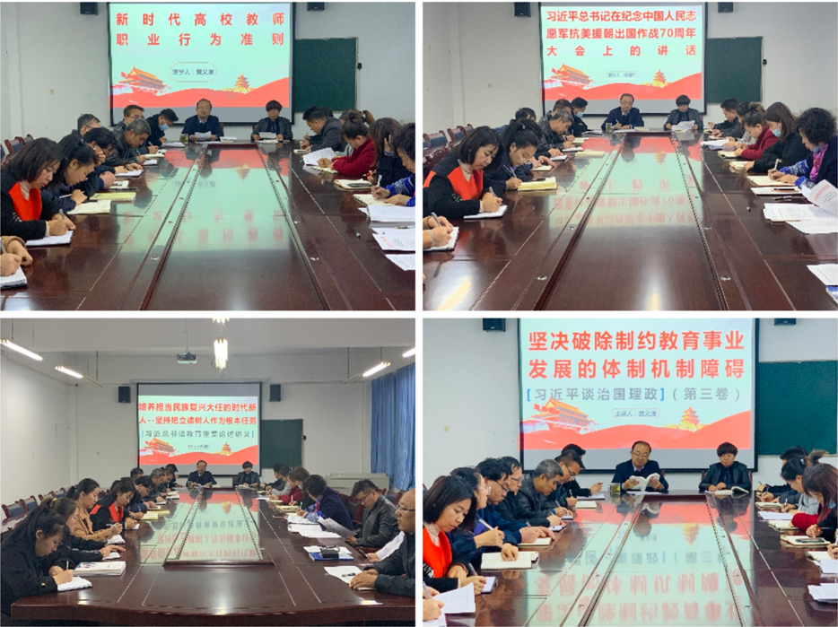 黃文源領(lǐng)學(xué)了《習(xí)近平談治國理政》(第三卷)第十二條 提高保障和改善民生水平——堅(jiān)決破除制約教育事業(yè)發(fā)展的體質(zhì)機(jī)制障礙,解讀了《新時(shí)代高校教師職業(yè)行為十項(xiàng)準(zhǔn)則》,要求所有教師要做以德立身、以德立學(xué)、以德施教、以德育德的楷模。楊如松領(lǐng)學(xué)了《習(xí)近平總書記教育重要論述講義》第二講 培養(yǎng)擔(dān)當(dāng)民族復(fù)興大任的時(shí)代新人——堅(jiān)持把立德樹人作為根本任務(wù)。楊建紅老師領(lǐng)學(xué)了習(xí)近平總書記在紀(jì)念中國 人民志愿軍抗美援朝出國作戰(zhàn)70周年大會的講話。