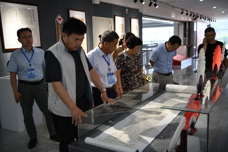 會后,考察組一行在學(xué)院領(lǐng)導(dǎo)的陪同下先后參觀考察了學(xué)院紅色文化藝術(shù)館、中華優(yōu)秀傳統(tǒng)文化藝術(shù)作品展,趙明向考察組做了詳細(xì)講解。