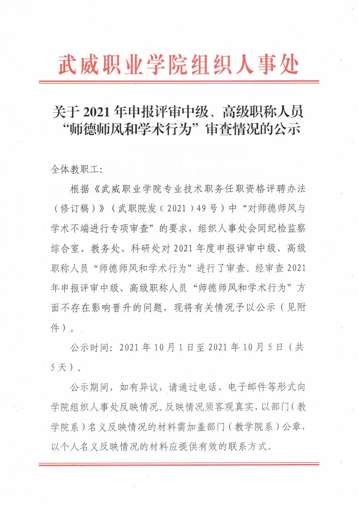 關(guān)于2021年申報(bào)評審中級(jí)、高級(jí)職稱人員“師德師風(fēng)和學(xué)術(shù)行為”審查情況的公示