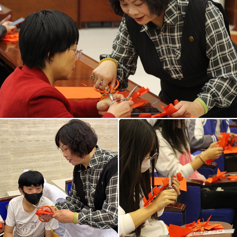 鄭霞從剪紙風(fēng)格、剪紙技巧、剪紙?jiān)瓌t等方面深入淺出地介紹了剪紙技藝的基本理論,并為學(xué)校捐贈(zèng)了2幅剪紙作品,展示了16幅系列作品,得到師生一致好評。講座最吸引人的是動(dòng)手實(shí)操環(huán)節(jié),鄭霞老師親身傳藝,為與會的師生展示了五星、喜字、窗花等的剪法,與會者興致勃勃地參與其中,喜悅與驚呼隨著作品一起迸發(fā)。許多學(xué)生表示,剪紙藝術(shù)很有魅力,愿意跟隨鄭霞老師學(xué)習(xí)技藝,做中華文明的傳承者。