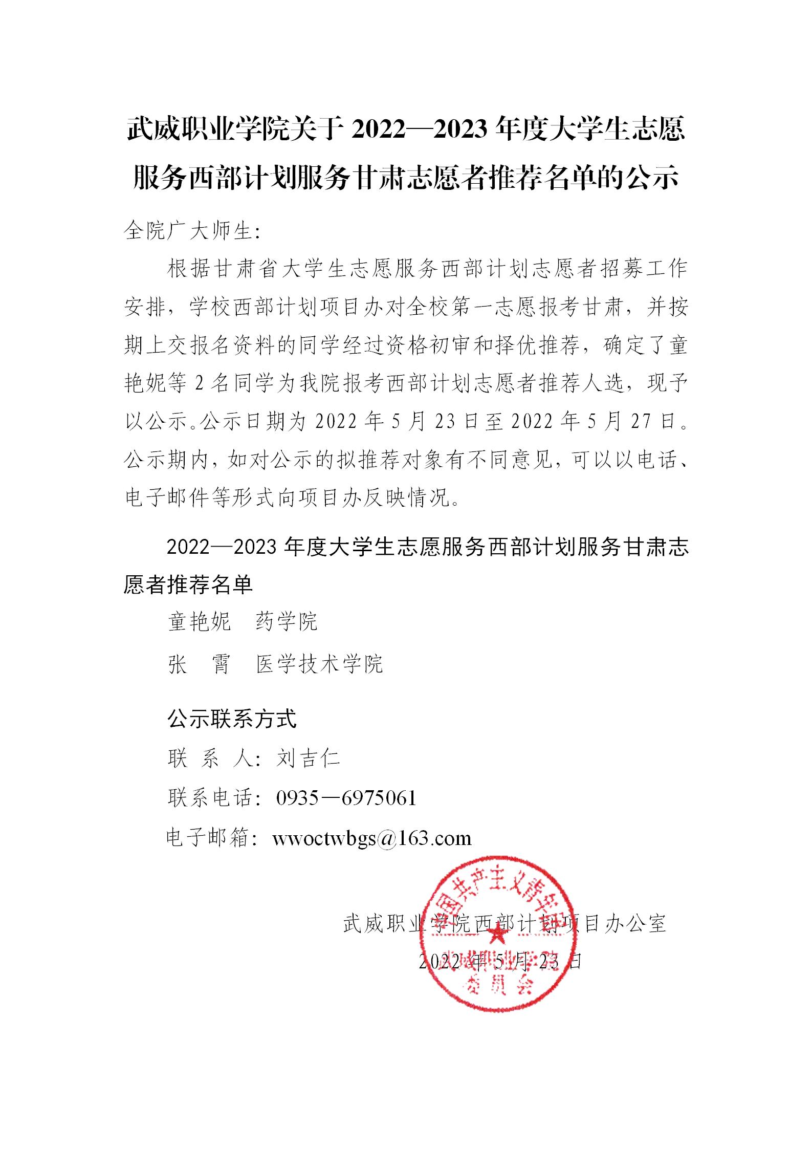 武威職業(yè)學(xué)院關(guān)于2022—2023年度大學(xué)生志愿服務(wù)西部計劃服務(wù)甘肅志愿者推薦名單的公示