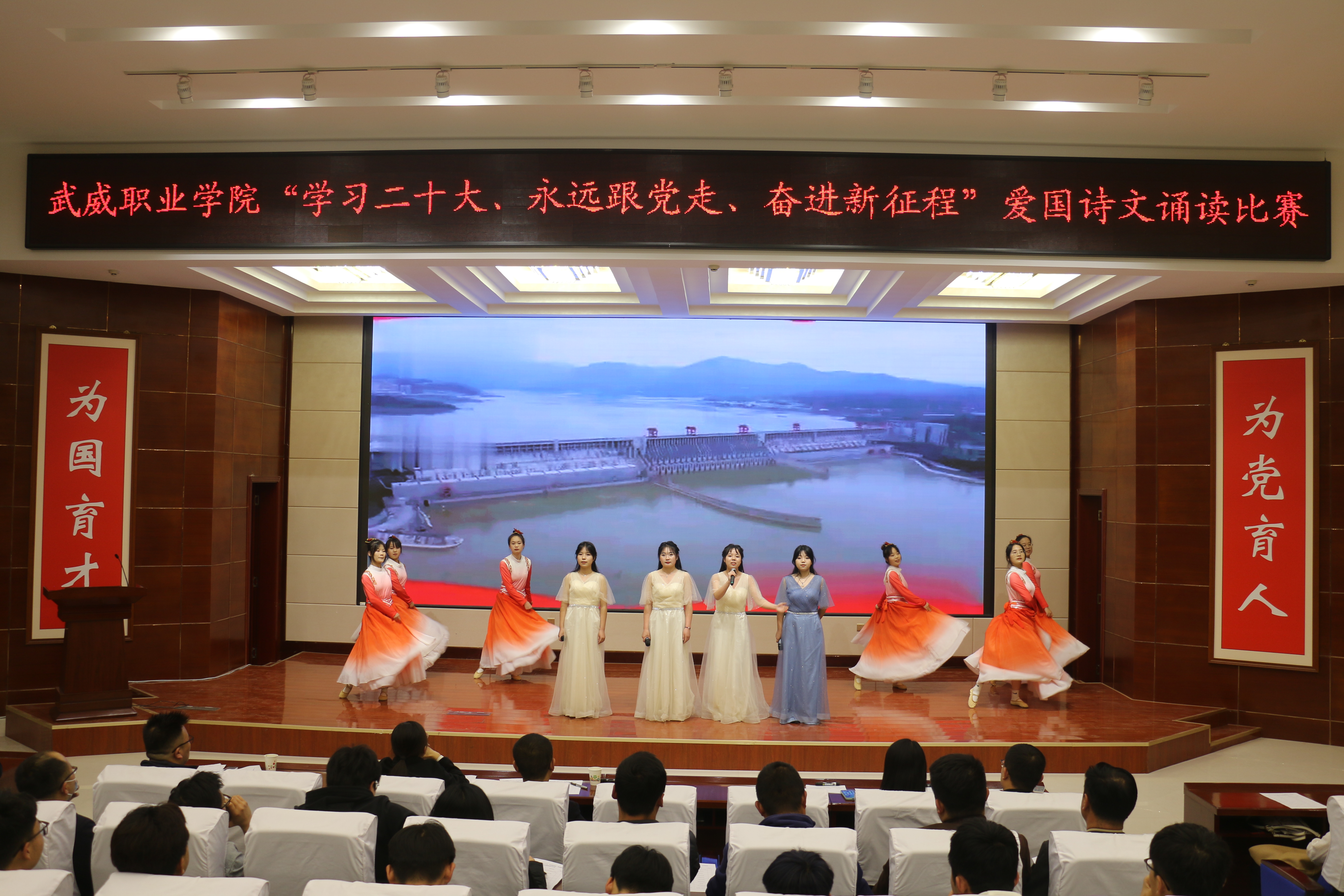 4月21日晚,學(xué)校團(tuán)委在菁英廳舉辦“學(xué)習(xí)二十大,永遠(yuǎn)跟黨走,奮進(jìn)新征程”愛國詩文誦讀比賽決賽。黨委委員、副校長王守云出席活動(dòng),相關(guān)部門負(fù)責(zé)人和各二級學(xué)院團(tuán)委書記及學(xué)生代表250余人觀看比賽。