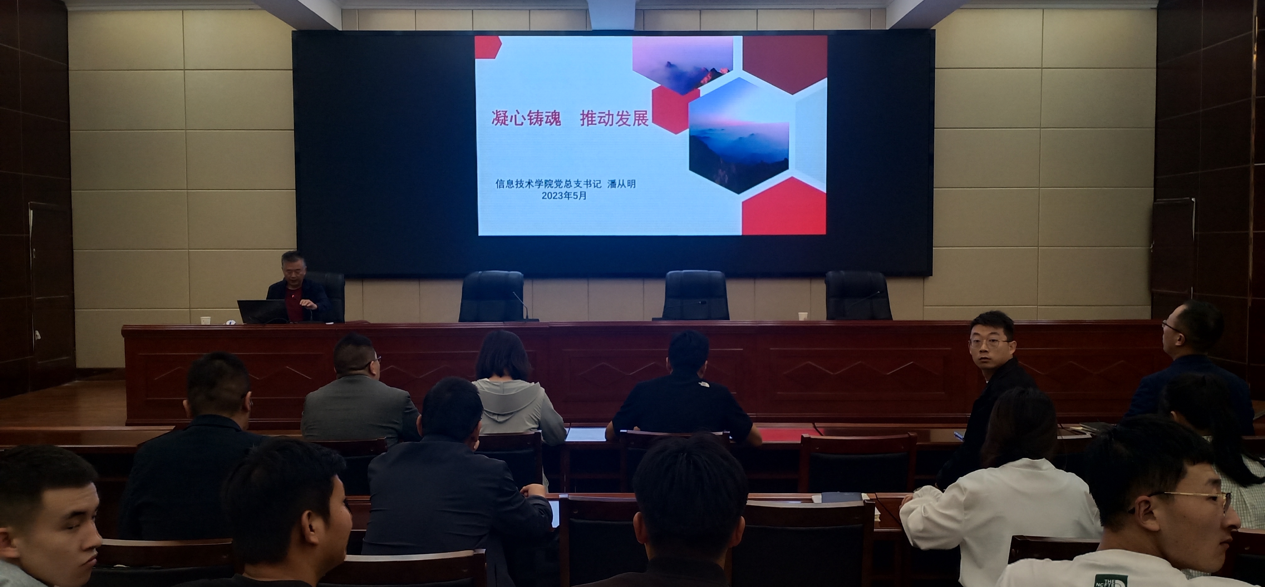 5月25日,信息技術(shù)學(xué)院黨總支開展學(xué)習(xí)貫徹習(xí)近平新時(shí)代中國(guó)特色社會(huì)主義思想主題教育專題黨課。黨總支書記潘從明以《凝心鑄魂 推動(dòng)發(fā)展》為題講授主題教育專題黨課,全體師生黨員參加會(huì)議。