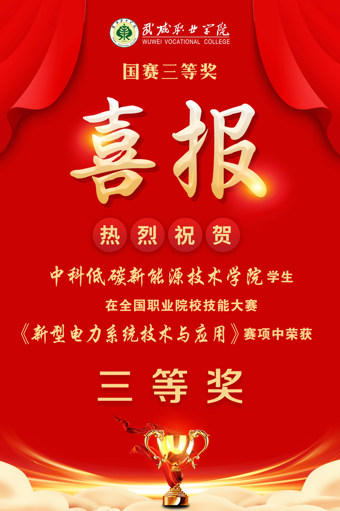 在2023年全國職業(yè)院校技能大賽中中科低碳新能源技術學院學生陳德平、徐浩芝、蘆紀維獲得高職組新型電力系統(tǒng)技術與應用賽項團體三等獎。