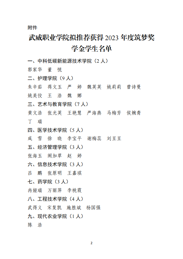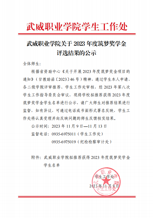 武威職業(yè)學(xué)院關(guān)于2023年度筑夢獎學(xué)金評選結(jié)果的公示