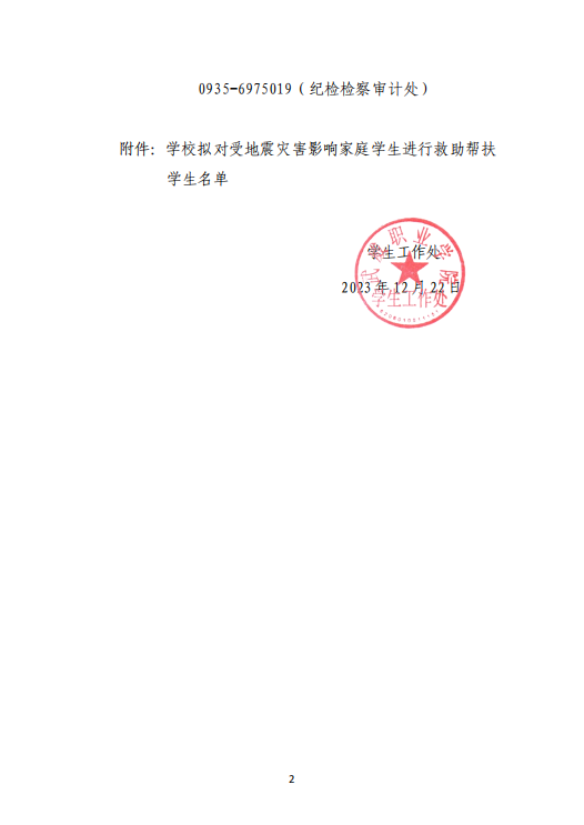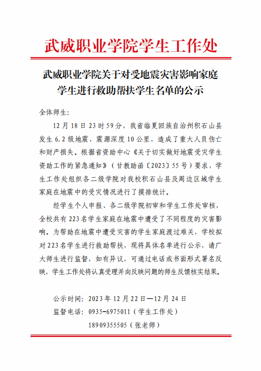 武威職業(yè)學(xué)院關(guān)于對受地震災(zāi)害影響家庭學(xué)生進(jìn)行救助幫扶學(xué)生名單的公示