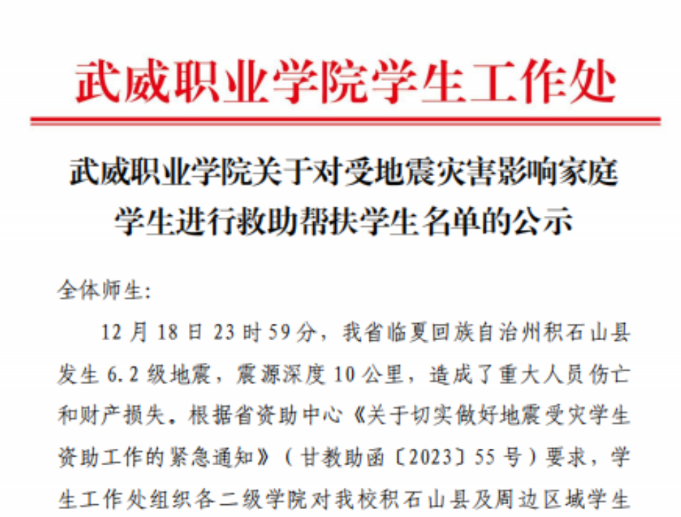 12月18日23時59分,我省臨夏回族自治州積石山縣發(fā)生6.2級地震。地震發(fā)生后,學校高度重視災區(qū)學生家庭受災情況,密切關注各項災情的發(fā)展變化,第一時間對積石山縣及周邊區(qū)域地震受災家庭學生情況進行摸排,迅速啟動救助幫扶關愛工作。