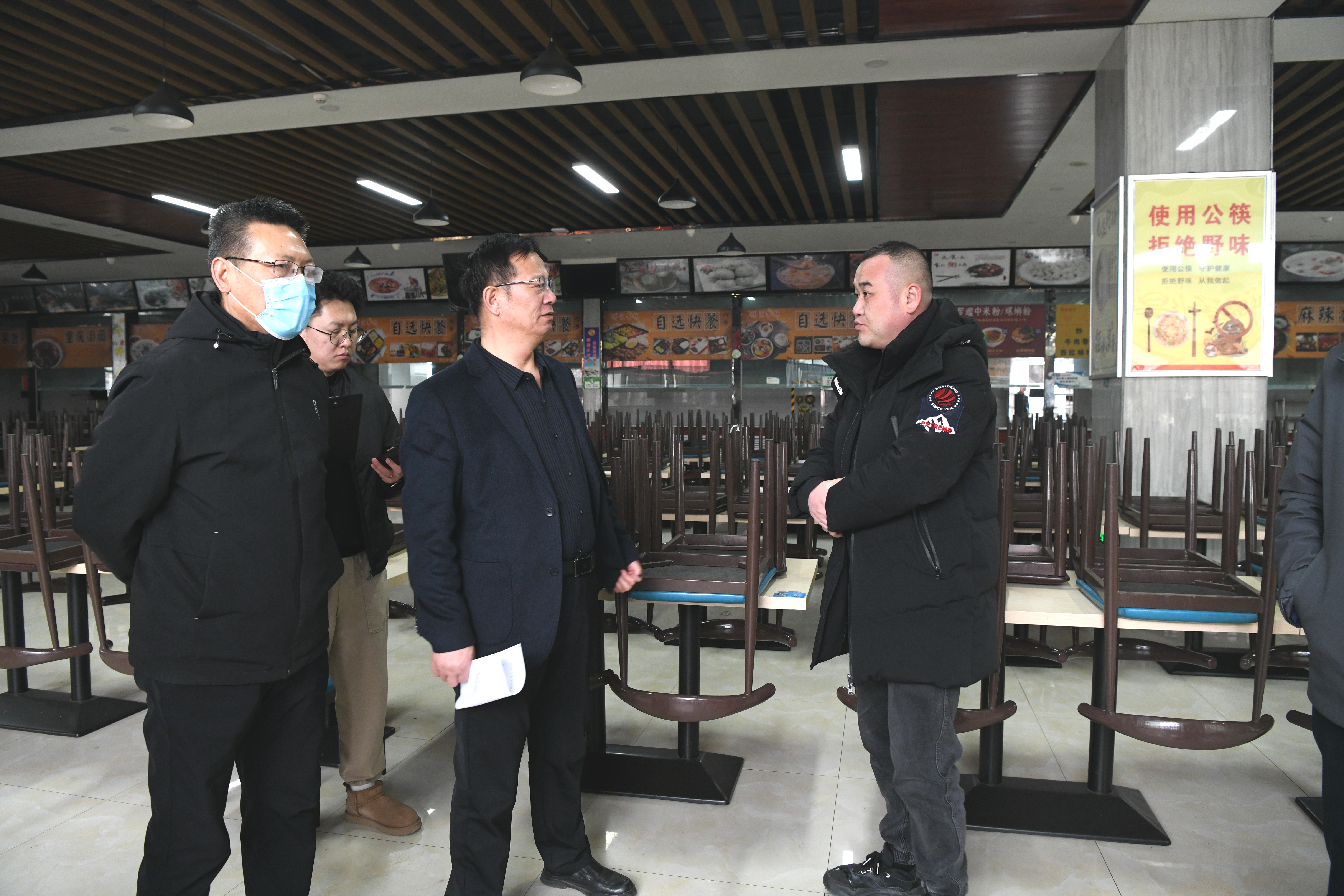 在食堂,張開禮實地查看了食堂環(huán)境衛(wèi)生及食堂的每個功能間,還向工作人員仔細詢問了餐具消毒、原材料采購、驗收貯存、制作加工、食品留樣以及備餐送餐等各個環(huán)節(jié)流程,并查閱了食堂從業(yè)人員健康體檢等相關(guān)資料。