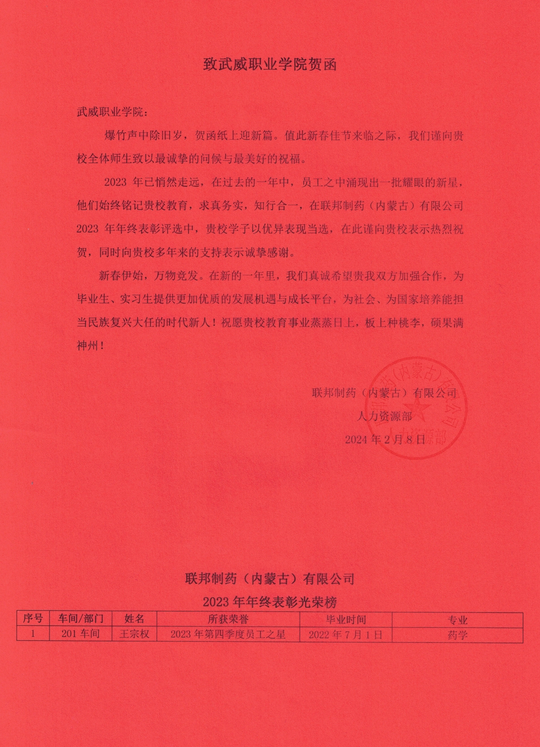 2月初,聯(lián)邦制藥(內蒙古)有限公司向學校發(fā)來賀信,在信中感謝學校輸送眾多優(yōu)秀畢業(yè)生,表彰畢業(yè)生在工作中取得的優(yōu)異成績。其中,2022屆畢業(yè)生王宗權榮獲企業(yè)2023年第四季度員工之星。此外,聯(lián)邦制藥(內蒙古)有限公司表示愿與學校繼續(xù)加強校企合作,共同為畢業(yè)生提供更加優(yōu)質的發(fā)展機遇與成長平臺,為社會、為國家培養(yǎng)能擔當民族復興大任的時代新人!