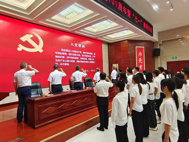 大會(huì)在嘹亮的國歌聲中拉開帷幕。面對鮮紅的黨旗,新黨員進(jìn)行入黨宣誓、老黨員重溫入黨誓詞。