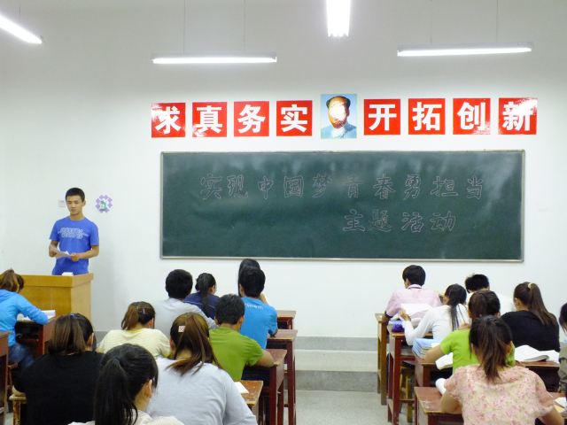 2013年5月20日,藥學(xué)系組織全體班團(tuán)干部在4號(hào)教學(xué)樓410教室開展了“實(shí)現(xiàn)中國夢,青春勇?lián)?dāng)”的主題班團(tuán)干部會(huì)活動(dòng),同學(xué)們認(rèn)真聆聽了習(xí)近平在同各界優(yōu)秀青年代表座談時(shí)的講話,習(xí)近平強(qiáng)調(diào),青年最富有朝氣,最富有夢想,青年興則國興,青年強(qiáng)則國強(qiáng)。