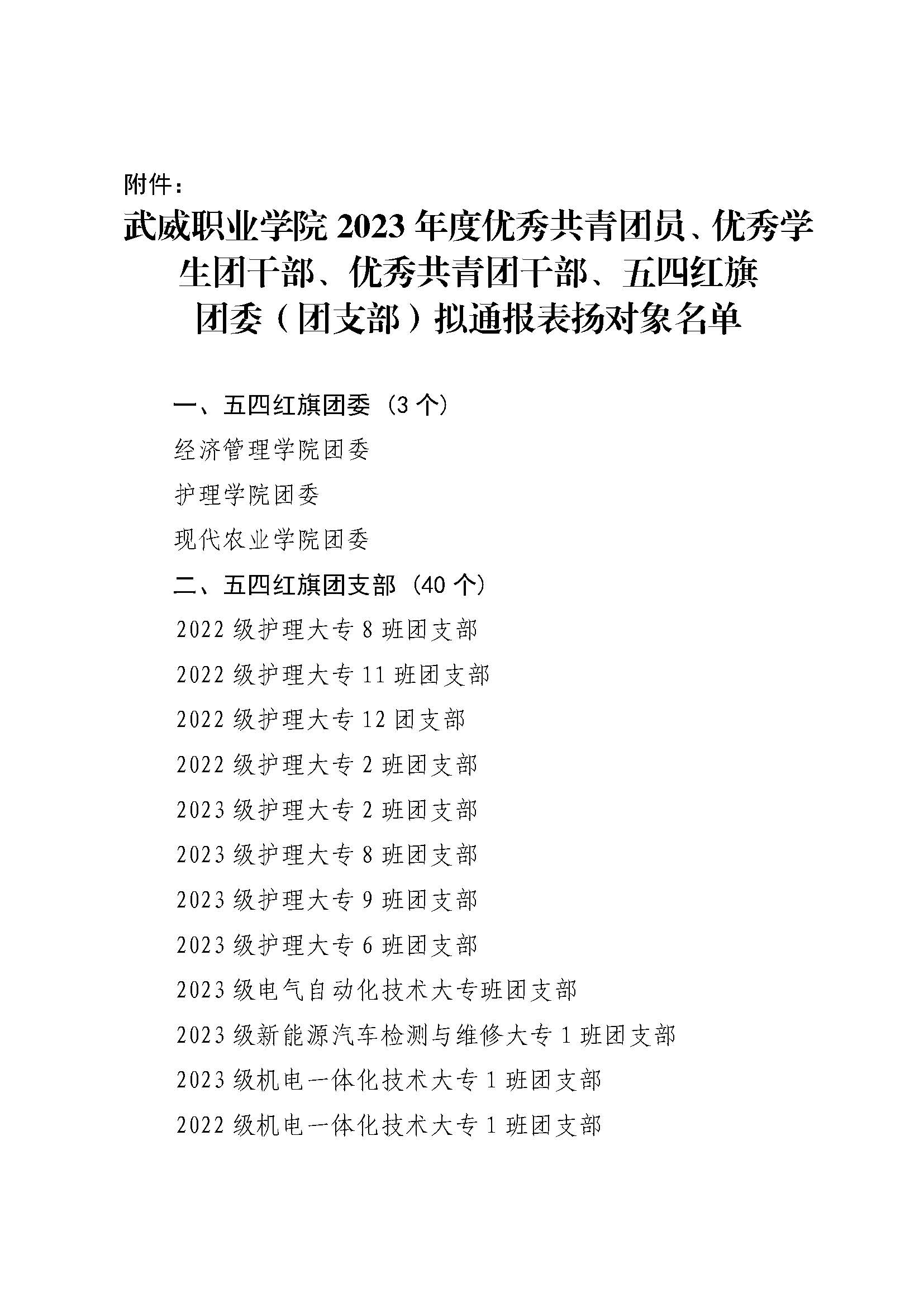 關(guān)于武威職業(yè)學(xué)院2023年度優(yōu)秀共青團(tuán)員、優(yōu)秀學(xué)生團(tuán)干部、優(yōu)秀共青團(tuán)干部、五四紅旗團(tuán)委(團(tuán)支部)擬通報(bào)表揚(yáng)對(duì)象的公示
