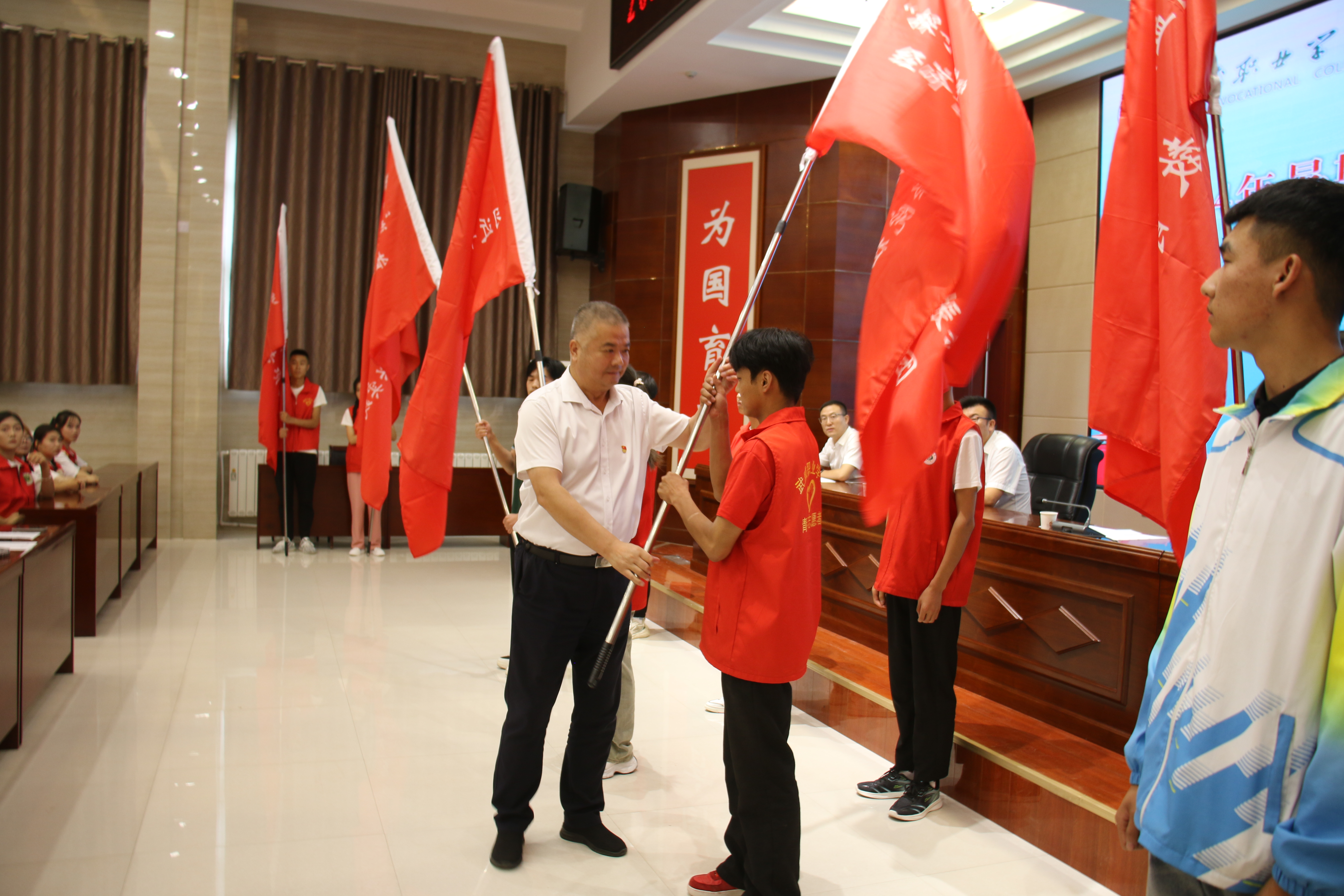 王守云為國(guó)家級(jí)和省級(jí)重點(diǎn)立項(xiàng)團(tuán)隊(duì)授旗,并對(duì)即將啟程的實(shí)踐團(tuán)隊(duì)提出三點(diǎn)希望和要求:一是要緊扣活動(dòng)主題,在學(xué)思踐悟中筑牢信仰根基;二是積極探索實(shí)踐,在篤行實(shí)干中練就過(guò)硬本領(lǐng);三是主動(dòng)擔(dān)當(dāng)作為,在踔厲奮發(fā)中展示武職風(fēng)采。希望同學(xué)們向下扎根、向上生長(zhǎng),鍛煉自我的同時(shí),筑牢“安全防線”,高質(zhì)量開(kāi)展本次社會(huì)實(shí)踐活動(dòng),收獲成長(zhǎng)與進(jìn)步,將“三下鄉(xiāng)”活動(dòng)打造為我校形象展示的重要窗口和靚麗名片。