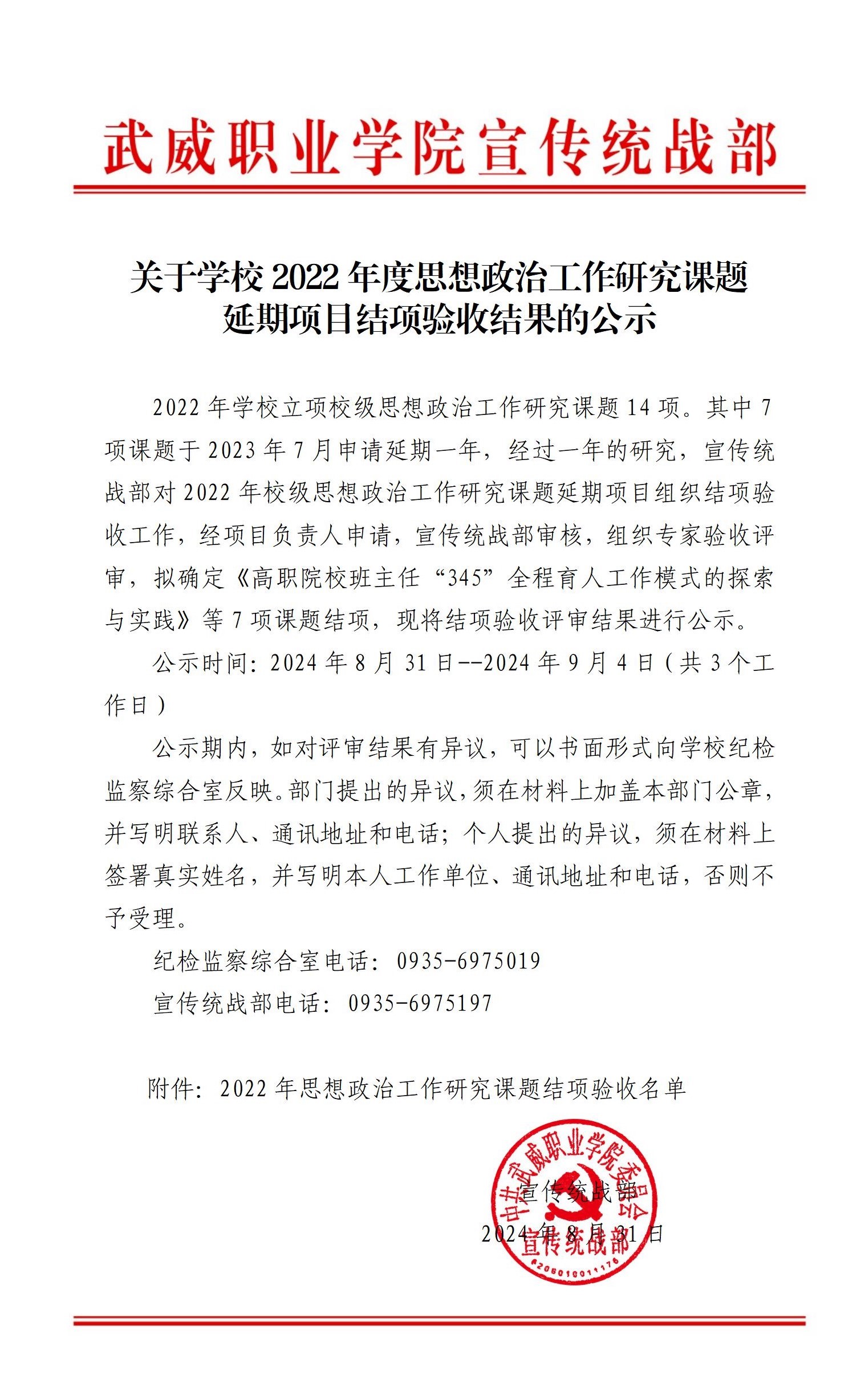 關(guān)于學(xué)校2022年度思想政治工作研究課題延期項(xiàng)目結(jié)項(xiàng)驗(yàn)收結(jié)果的公示