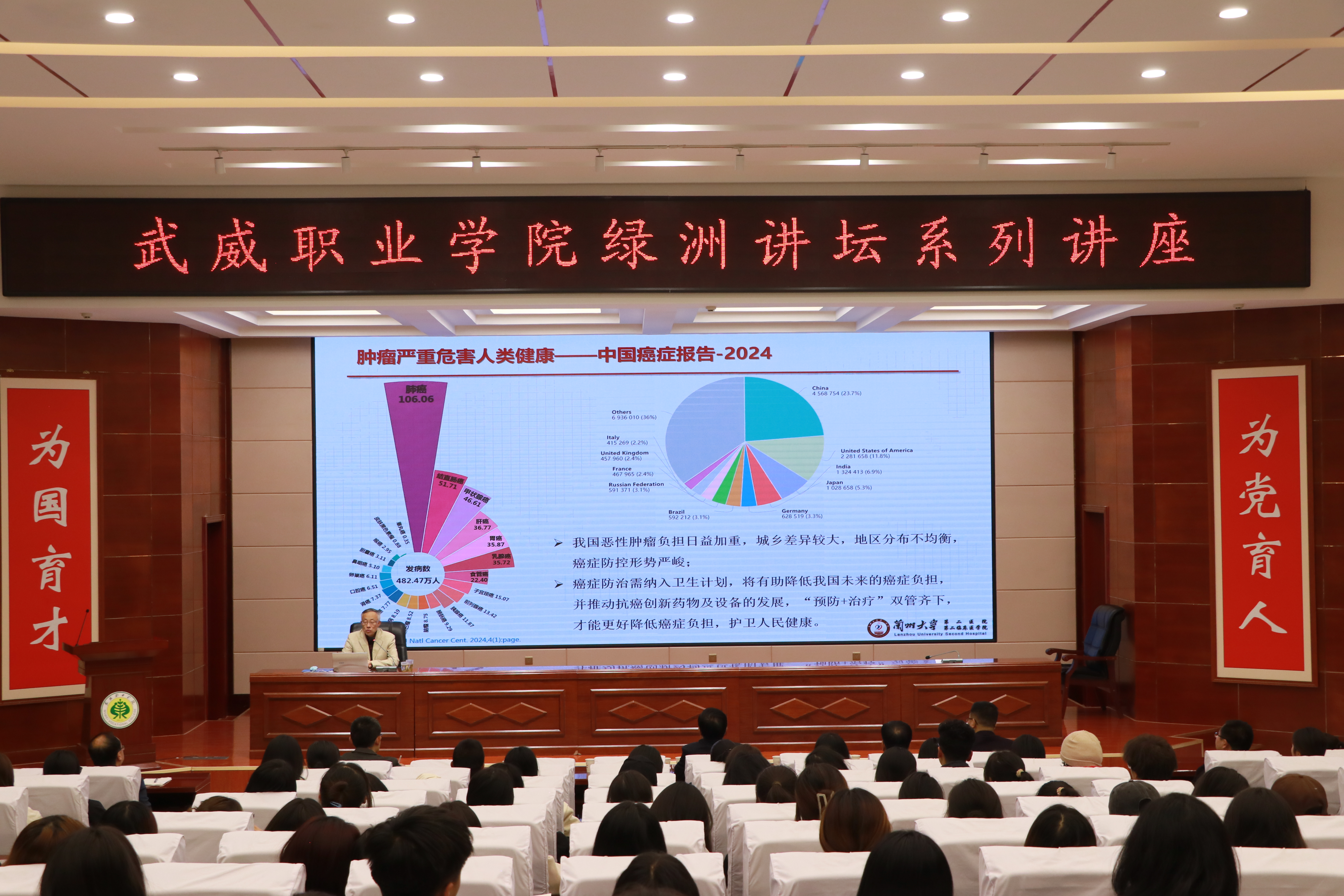 報(bào)告會由學(xué)校校長、黨委副書記張開禮主持,特邀蘭州大學(xué)第二醫(yī)院王志平教授作了“腫瘤臨床放射治療的過去、現(xiàn)在和未來與人才”的主題講座,甘肅省武威醫(yī)學(xué)科學(xué)院腫瘤醫(yī)院醫(yī)護(hù)人員代表、蘭州大學(xué)實(shí)習(xí)生代表和學(xué)校師生代表共計(jì)220余人參加了報(bào)告會。