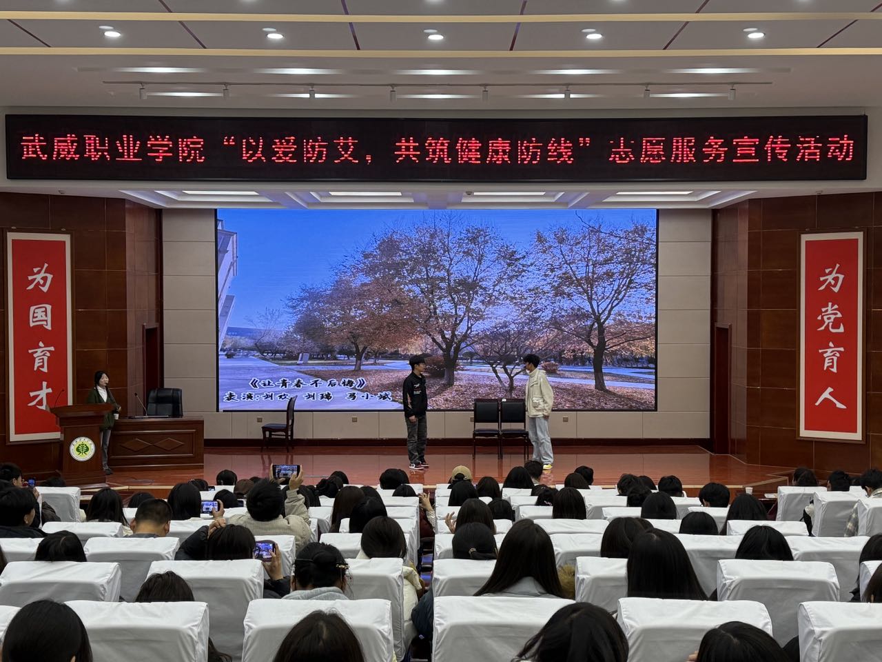 講座過后,現(xiàn)場演出了由護(hù)理學(xué)院編排的“讓青春不后悔”情景劇,生動(dòng)形象展示了大學(xué)生防艾的必要性,掀起了宣講活動(dòng)的高潮。隨后,24級(jí)護(hù)理專業(yè)石佳麗同學(xué)向大家發(fā)出倡議,倡導(dǎo)“大家都要成為自身健康的守護(hù)者”,樹立起正確的防艾健康觀念,營造眾人共同參與防艾抗艾的良好社會(huì)氛圍。