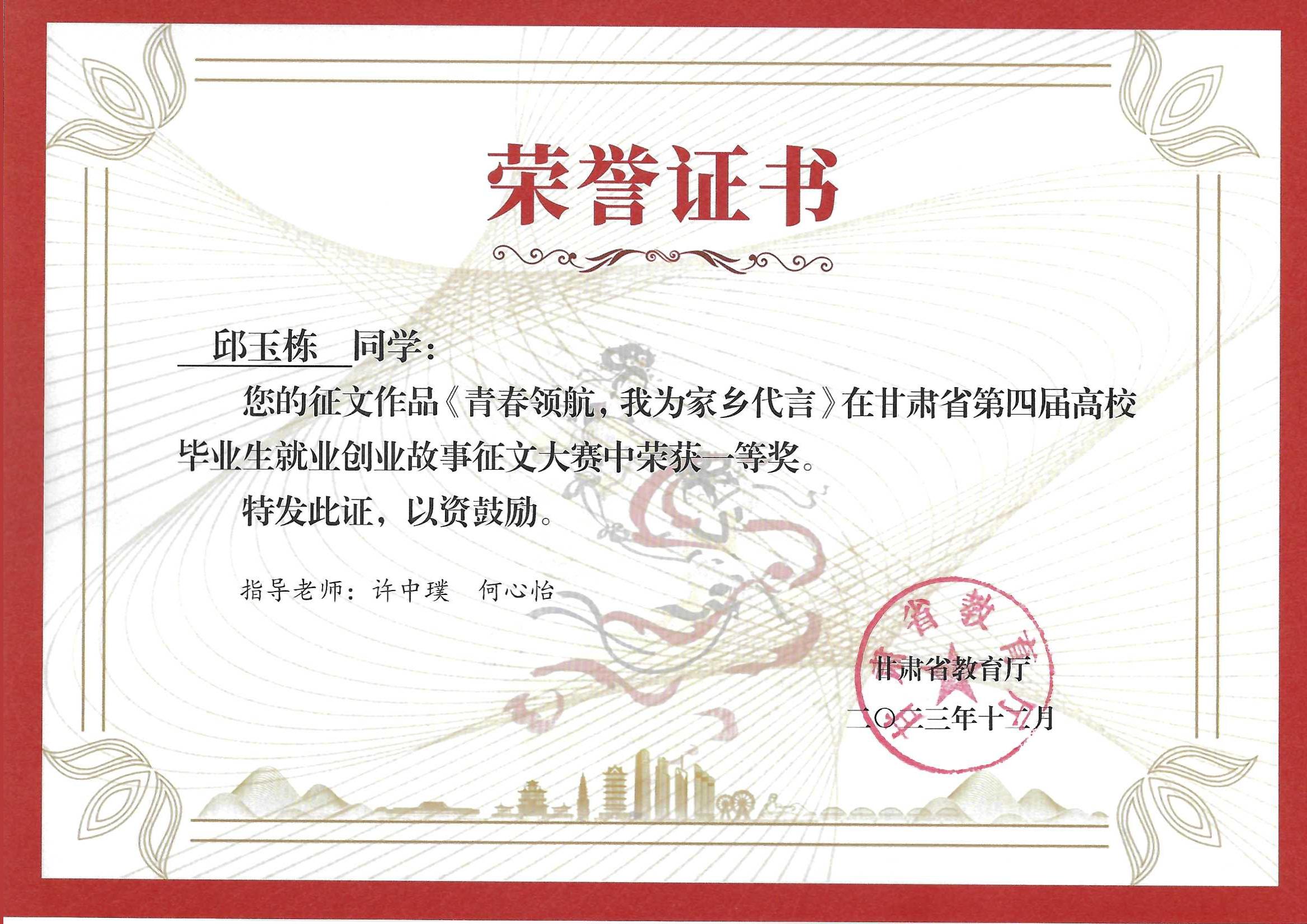 2023年學(xué)生在甘肅省第四屆高校畢業(yè)生就業(yè)創(chuàng)業(yè)故事征文大賽獲一等獎(jiǎng)