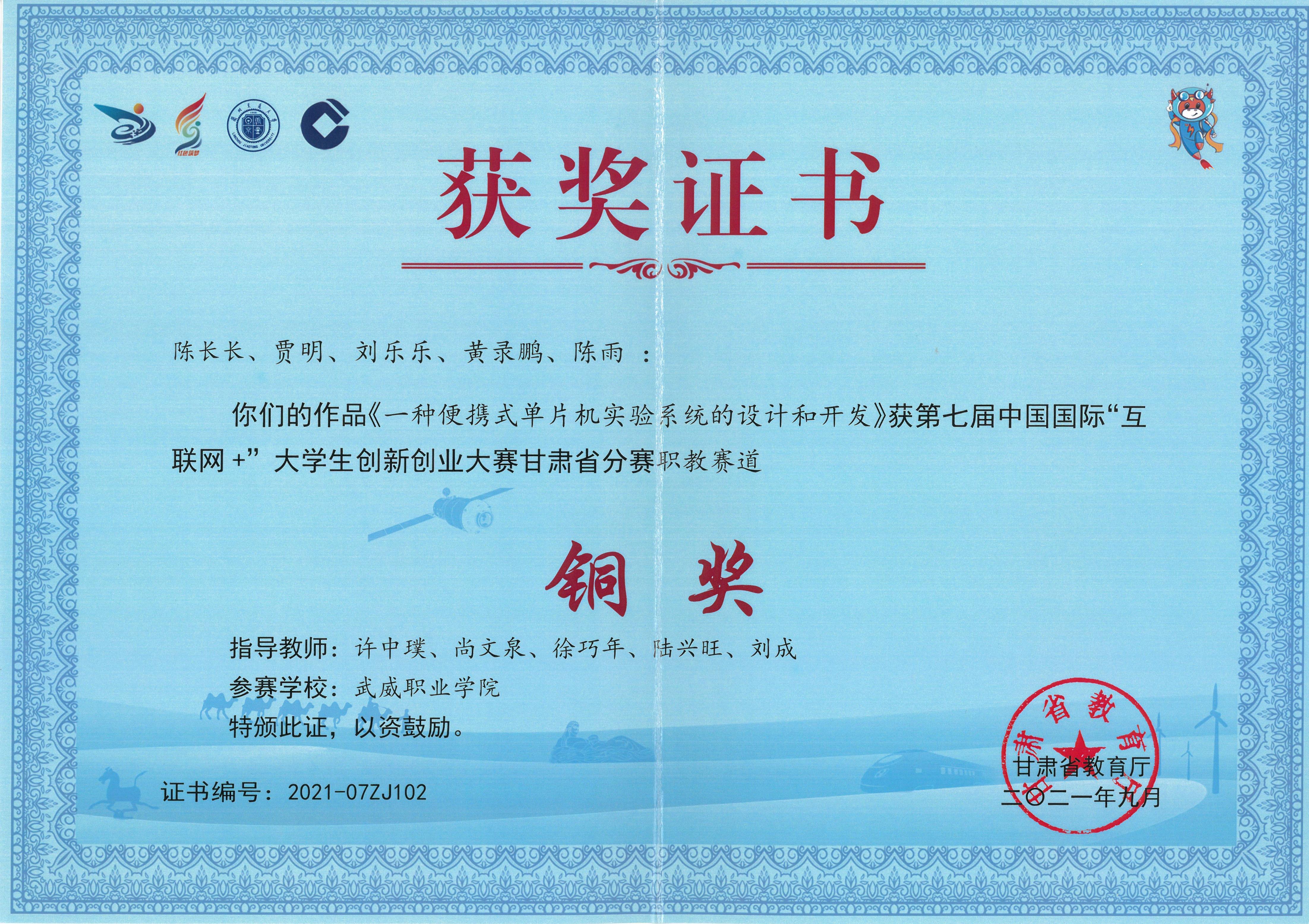 2021年學(xué)生獲第七屆中國國際“互聯(lián)網(wǎng)+”大學(xué)生創(chuàng)新創(chuàng)業(yè)大賽甘肅賽區(qū)銅獎(jiǎng)