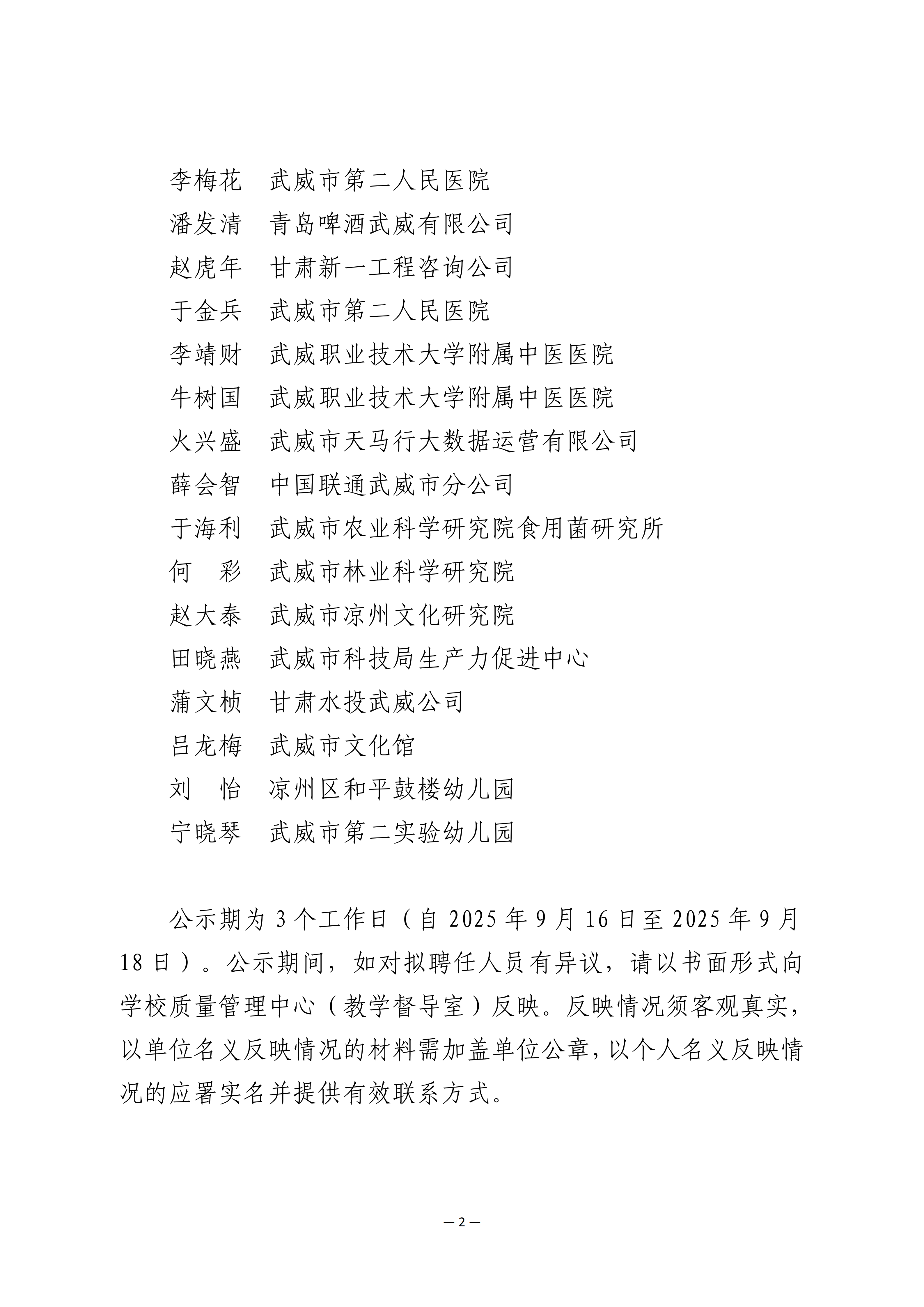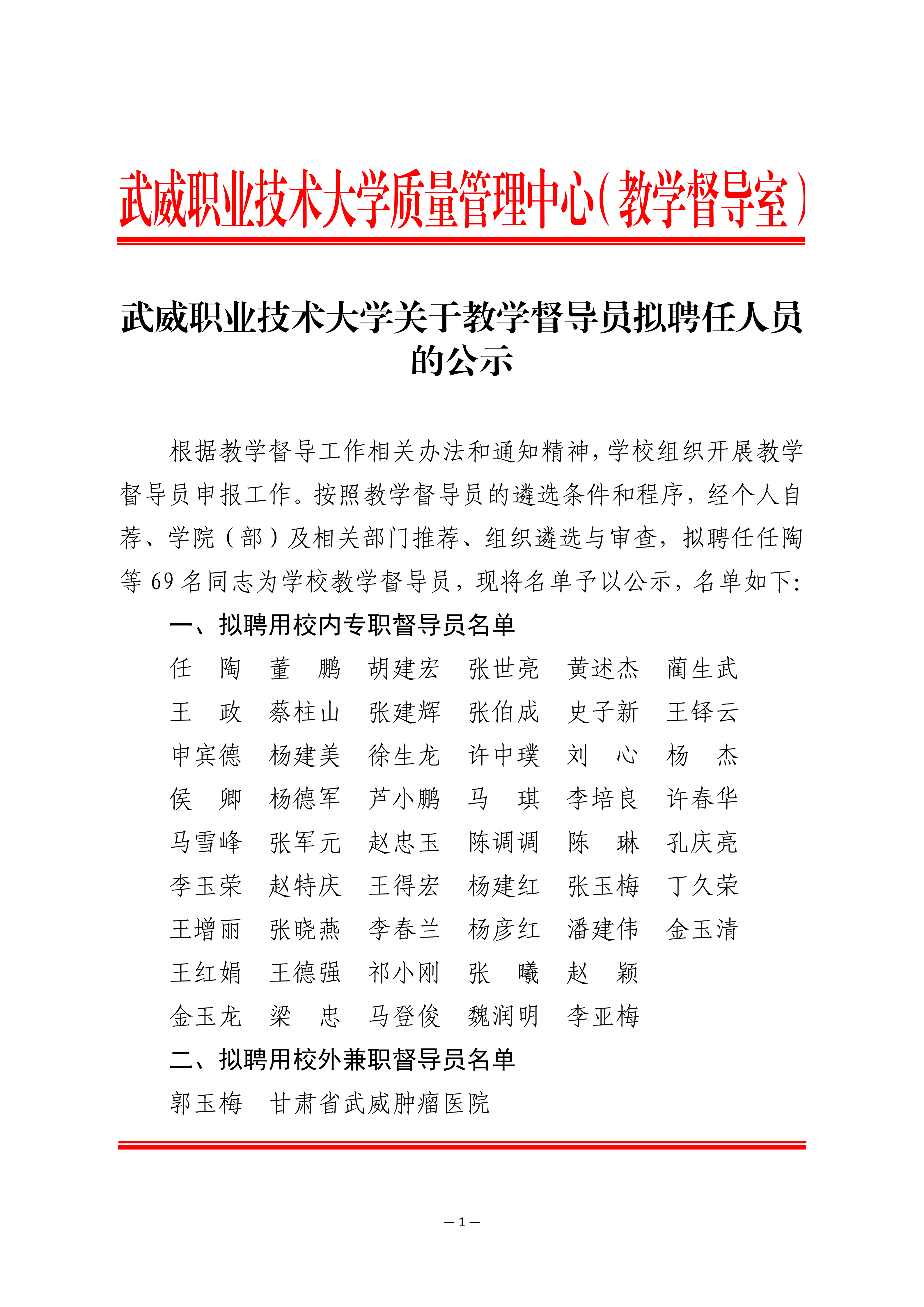 武威職業(yè)技術(shù)大學(xué)關(guān)于教學(xué)督導(dǎo)員擬聘任人員的公示