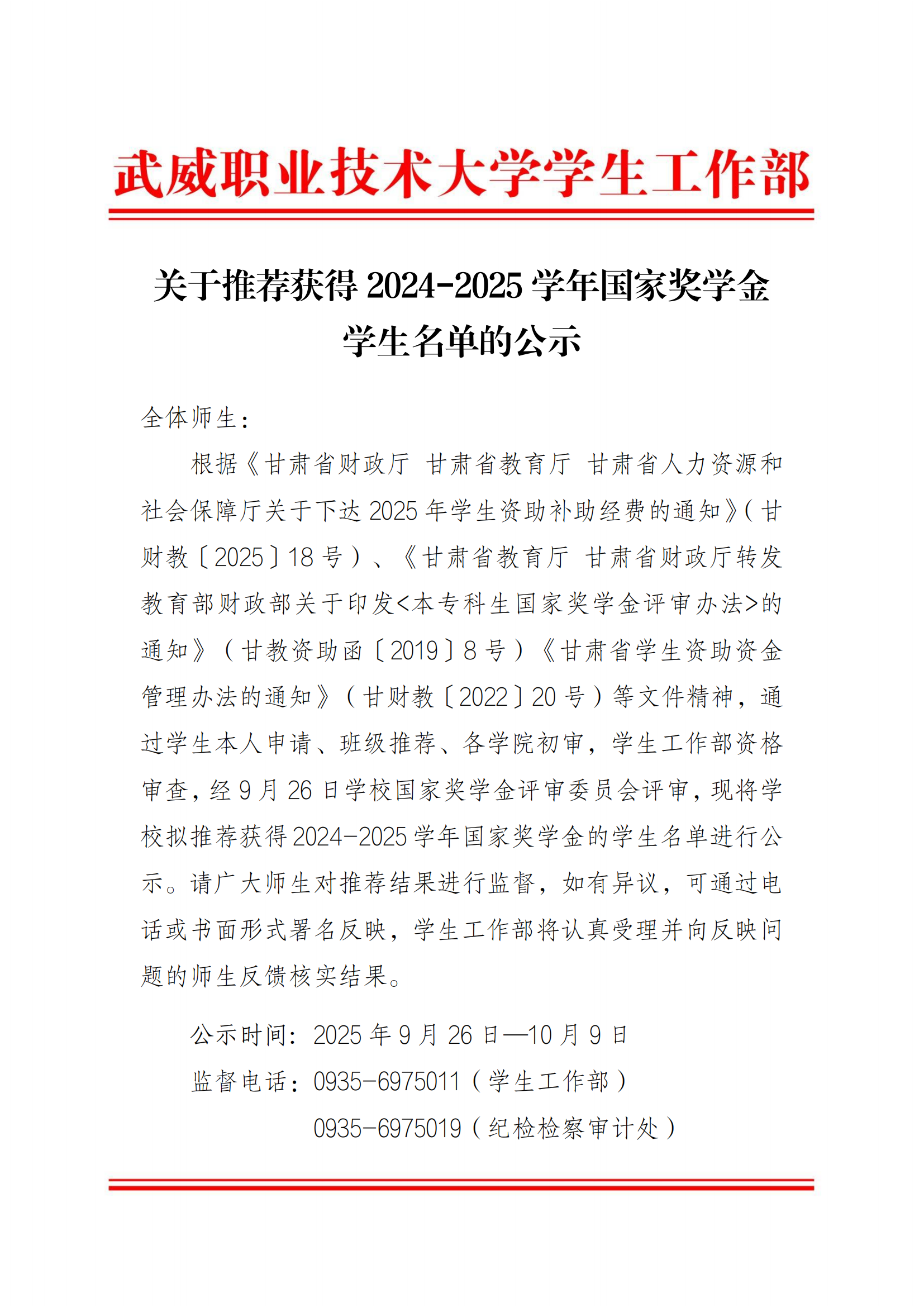 武威職業(yè)學(xué)院關(guān)于2023-2024學(xué)年第二批國(guó)家獎(jiǎng)學(xué)…