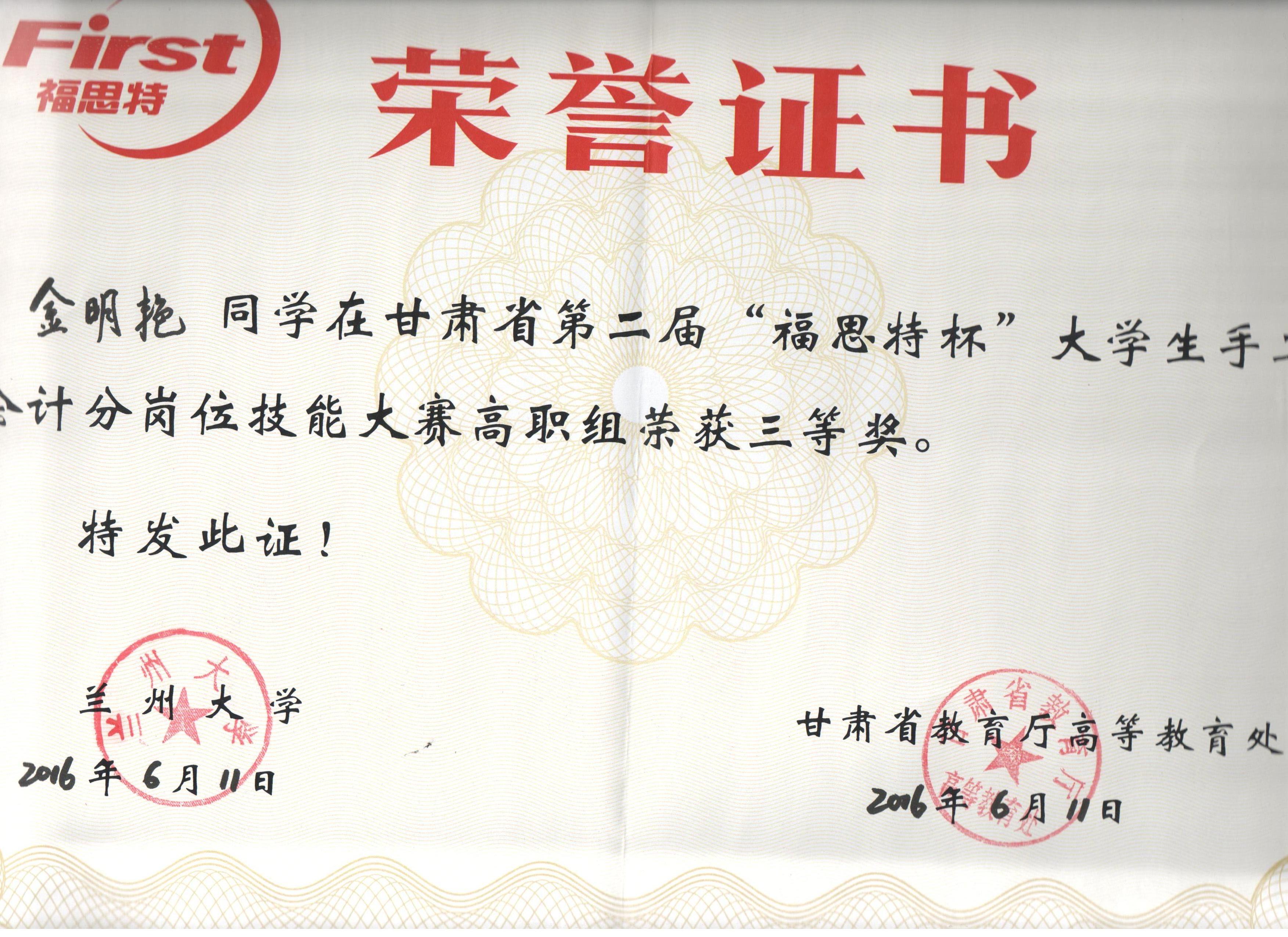 經(jīng)濟管理系李惠蘭老師指導我系會計專業(yè)學生參加甘肅省第二屆“福思特”大學生手工會計分崗位技能競賽,榮獲高職組三等獎。