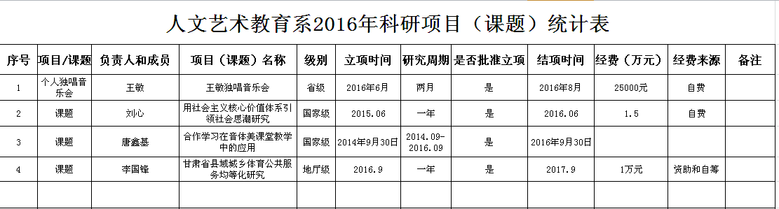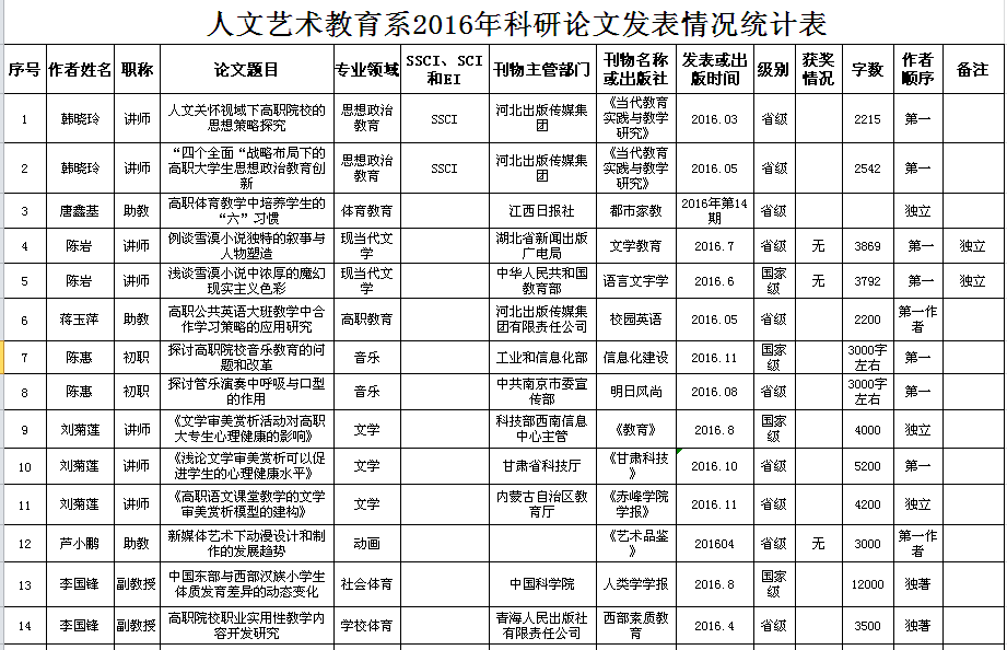 人文藝術(shù)教育系2016年科研成果統(tǒng)計(jì)
