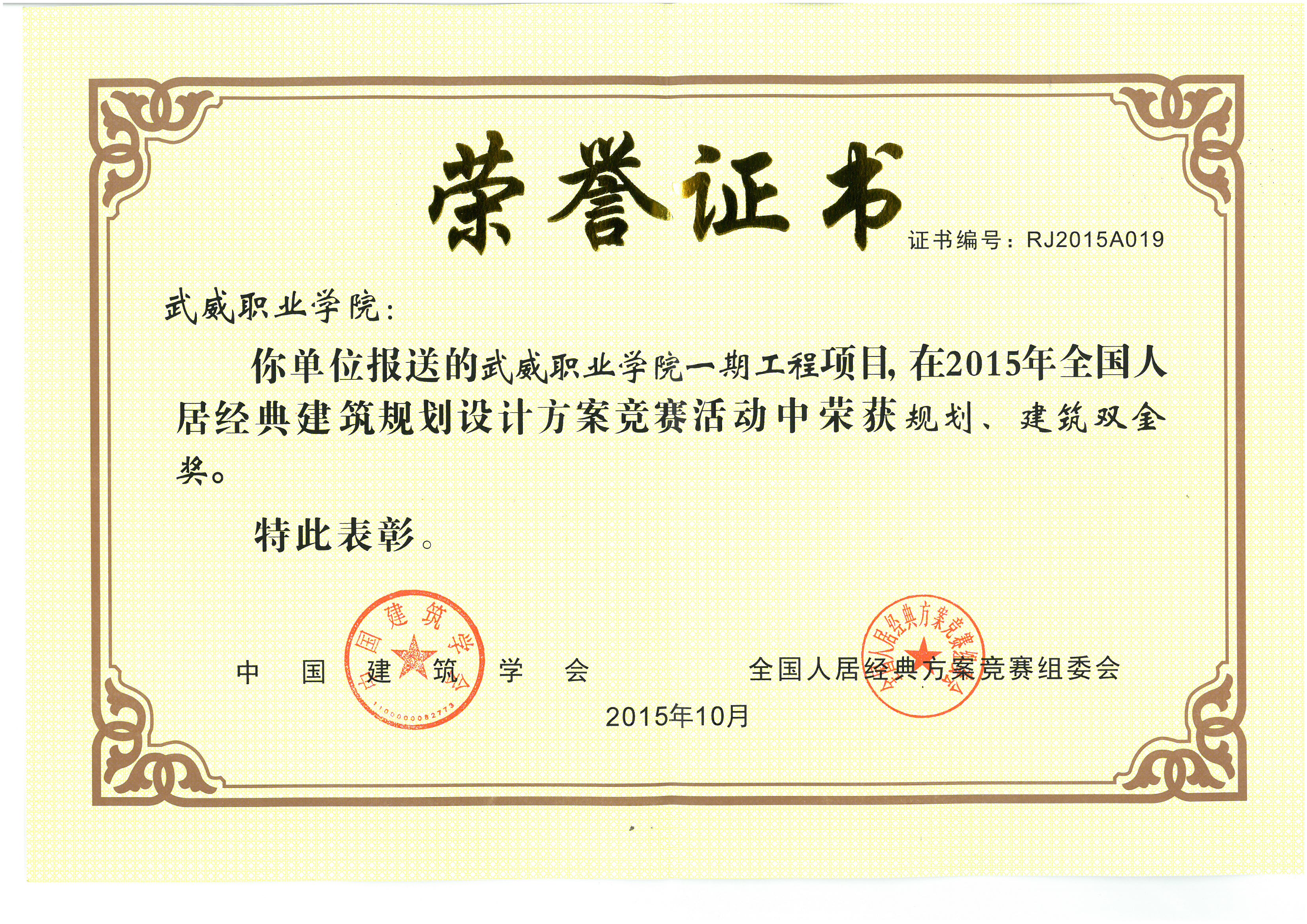 2015年10月,第十五屆全國(guó)人居經(jīng)典建筑規(guī)劃設(shè)計(jì)方案競(jìng)賽結(jié)果在北京揭曉,我院報(bào)送的武威職業(yè)學(xué)院一期擴(kuò)建項(xiàng)目在全國(guó)眾多參賽項(xiàng)目中脫穎而出,榮膺規(guī)劃、建筑雙金獎(jiǎng)。全國(guó)人居經(jīng)典方案競(jìng)賽由中國(guó)建筑學(xué)會(huì)主辦,全國(guó)人居經(jīng)典方案競(jìng)賽組委會(huì)承辦,自2001年起每年舉辦一屆,參賽項(xiàng)目覆蓋全國(guó)所有省份及港澳臺(tái)地區(qū),評(píng)審專家皆為業(yè)界權(quán)威,獲獎(jiǎng)難度大,權(quán)威性高。榮膺規(guī)劃、建筑雙金獎(jiǎng)是武威建筑項(xiàng)目上的首次。