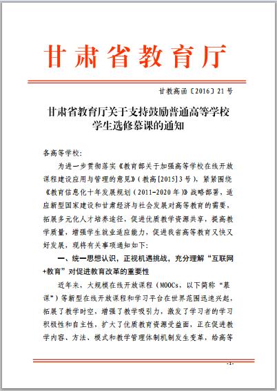 甘肅省教育廳關于支持鼓勵普通高等學校學生選修慕課的通知