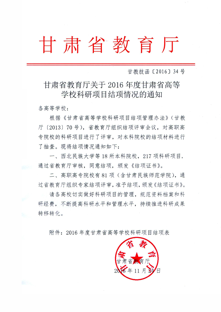 甘肅省教育廳關于2016年度甘肅省高等學??蒲许椖拷Y項情況的通知