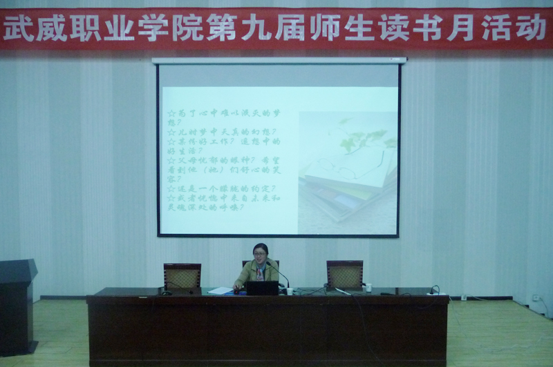 為在全院師生中營(yíng)造良好的讀書氛圍,豐富校園文化生活,在第22個(gè)世界讀書日來(lái)臨之際,4月20日,武威職業(yè)學(xué)院第九屆讀書月活動(dòng)專題講座在正德廳舉行。學(xué)院中文專業(yè)副教授、電子信息工程系主任李亞梅應(yīng)邀進(jìn)行了《為何而讀書》的專題講座,近300名師生參加了此次講座。