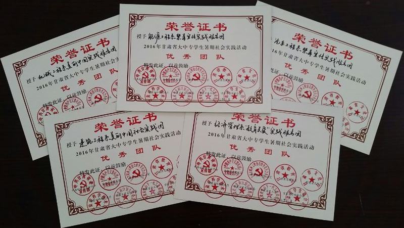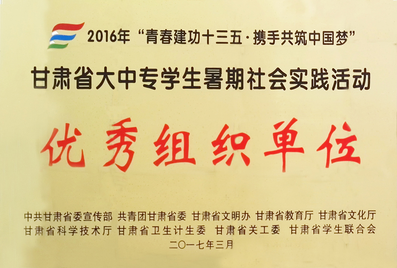 學(xué)院團(tuán)委被省委宣傳部、團(tuán)省委、省教育廳等九個(gè)部門評(píng)為2016年甘肅省大中專學(xué)生暑期社會(huì)實(shí)踐活動(dòng)“優(yōu)秀組織單位”,五個(gè)實(shí)踐團(tuán)隊(duì)被評(píng)為省級(jí)“優(yōu)秀團(tuán)隊(duì)”,五名同志被評(píng)為“先進(jìn)個(gè)人”,五名教師被評(píng)為 “優(yōu)秀指導(dǎo)教師”。