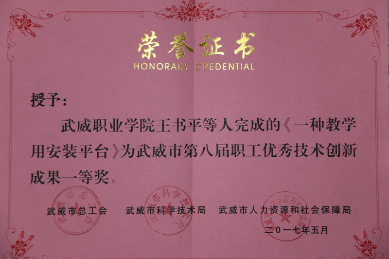 為貫徹落實(shí)武威市委、市政府關(guān)于《武威市十萬(wàn)職工職業(yè)技能素質(zhì)提升活動(dòng)工作方案(2016-2020年)》(武政辦發(fā)〔201672號(hào))文件精神,推動(dòng)我市“雙創(chuàng)”工作的深入開(kāi)展,激發(fā)我市廣大企事業(yè)職工提升技能和開(kāi)拓創(chuàng)新的熱情。近日,由市總工會(huì)、市人社局、市科技局等單位聯(lián)合舉辦了“武威市第八屆職工技術(shù)創(chuàng)新成果評(píng)選活動(dòng)”。本屆職工技術(shù)創(chuàng)新成果評(píng)選共征集創(chuàng)新成果87項(xiàng),其中:學(xué)院推薦了十項(xiàng)研究課題、專(zhuān)利技術(shù)項(xiàng)目,王書(shū)平團(tuán)隊(duì)《一種教學(xué)用安裝平臺(tái)》項(xiàng)目成果榮獲一等獎(jiǎng),申賓德團(tuán)隊(duì)《簡(jiǎn)易焊工考試用帶坡口鋼板火焰切割下料機(jī)的研究與應(yīng)用》,王勝團(tuán)隊(duì)《“胰美舒”治療2型糖尿病周?chē)窠?jīng)病變(氣陰兩虛兼瘀證)的臨床觀察》項(xiàng)目成果榮獲三等獎(jiǎng)。