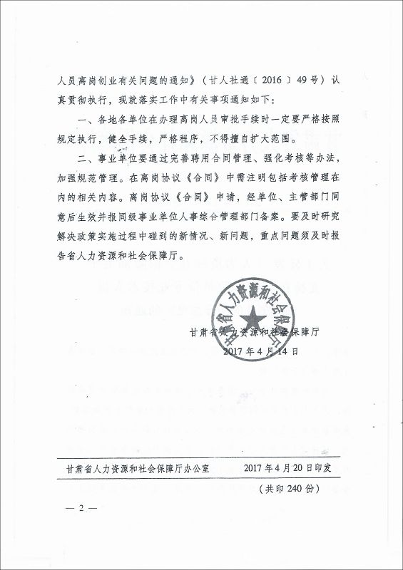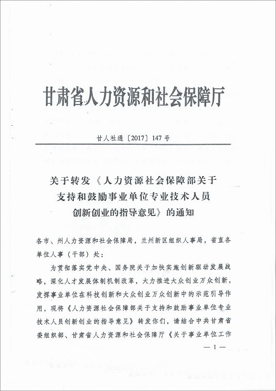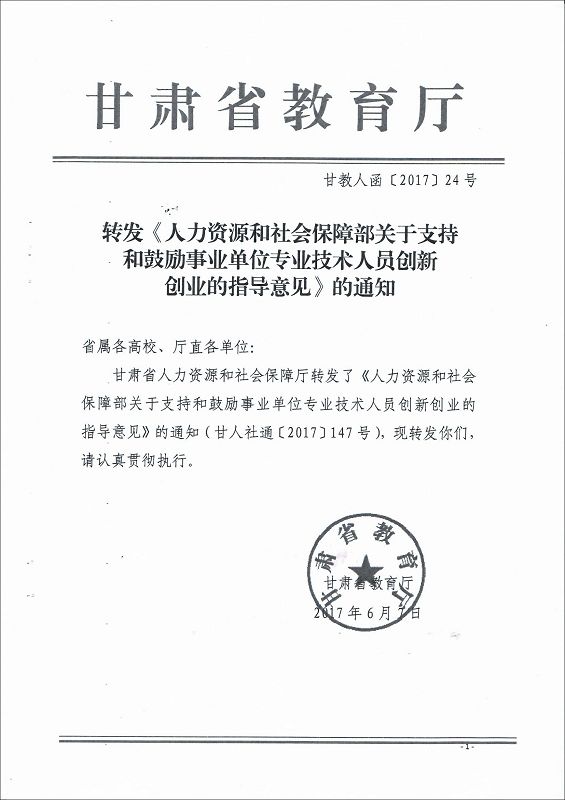 甘肅省教育廳轉(zhuǎn)發(fā)《人力資源和社會保障部關(guān)于支持和鼓勵事業(yè)單位專業(yè)技術(shù)人員創(chuàng)新創(chuàng)業(yè)的指導(dǎo)意見》的通知