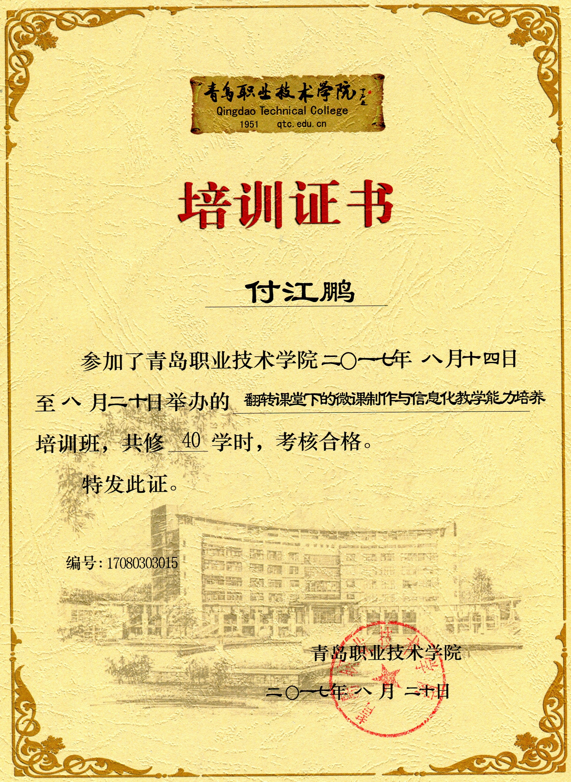 2017.8.14-8.20,我參加了由山東省教育廳在青島職業(yè)技術(shù)學(xué)院舉辦的《高校教師教學(xué)能力、信息技術(shù)與專業(yè)素養(yǎng)提升高級培訓(xùn)班》聯(lián)盟培訓(xùn)班。