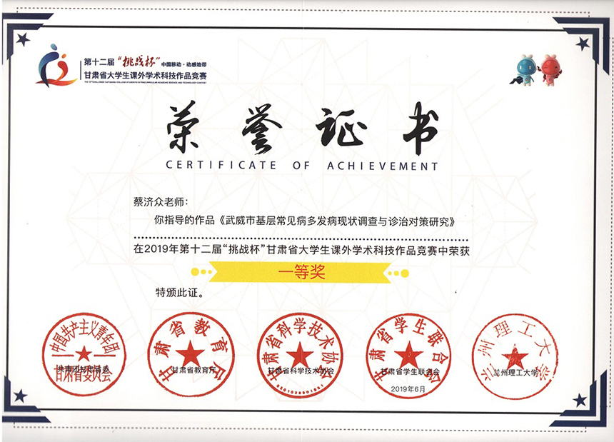 第十二屆“挑戰(zhàn)杯”甘肅省大學(xué)生課外學(xué)術(shù)科學(xué)作品《武威市基層常見病多發(fā)病現(xiàn)狀調(diào)查與診治對(duì)策研究》